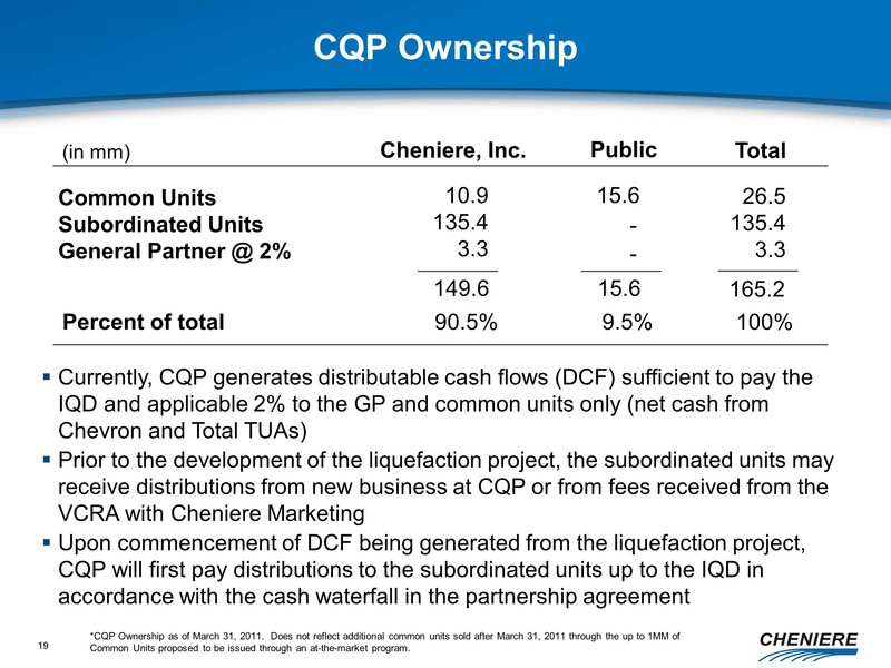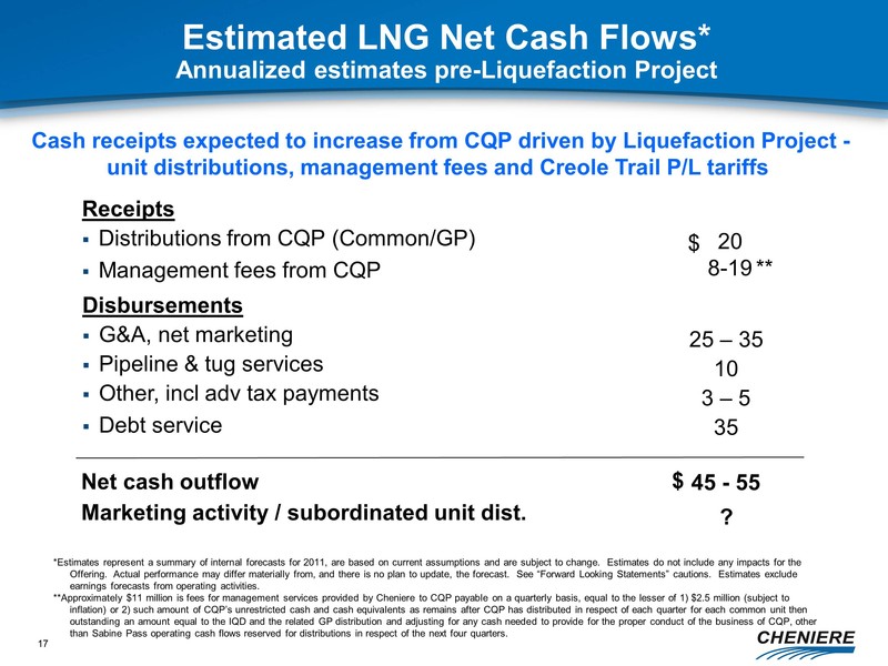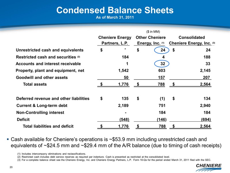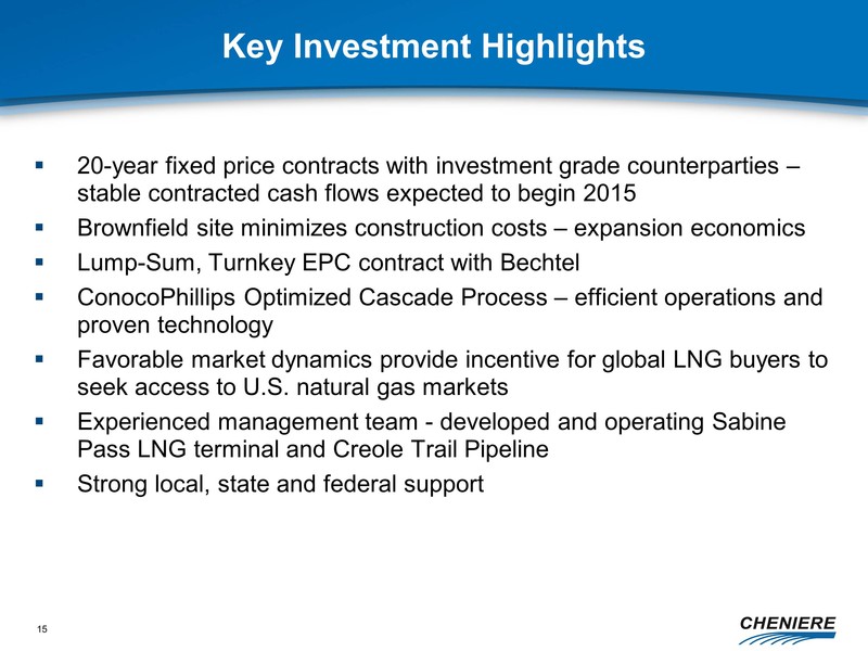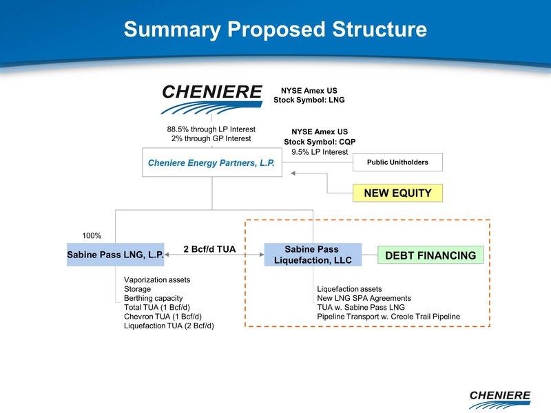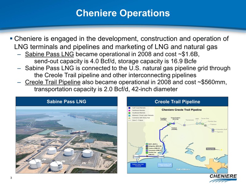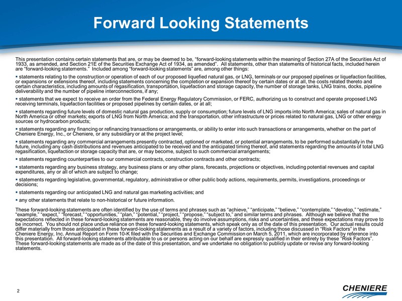 any other statements that relate to non-historical or future information. These forward-looking statements are often identified by the use of terms and phrases such as “achieve,” “anticipate,” “believe,” “contemplate,” “develop,” “estimate,” “example,” “expect,” “forecast,” “opportunities,” “plan,” “potential,” “project,” “propose,” “subject to,” and similar terms and phrases. Although we believe that the expectations reflected in these forward-looking statements are reasonable, they do involve assumptions, risks and uncertainties, and these expectations may prove to be incorrect. You should not place undue reliance on these forward-looking statements, which speak only as of the date of this presentation. Our actual results could differ materially from those anticipated in these forward-looking statements as a result of a variety of factors, including those discussed in “Risk Factors” in the Cheniere Energy, Inc. Annual Report on Form 10-K filed with the Securities and Exchange Commission on March 5, 2011, which are incorporated by reference into this presentation. All forward-looking statements attributable to us or persons acting on our behalf are expressly qualified in their entirety by these ”Risk Factors”. These forward-looking statements are made as of the date of this presentation, and we undertake no obligation to publicly update or revise any forward-looking statements.