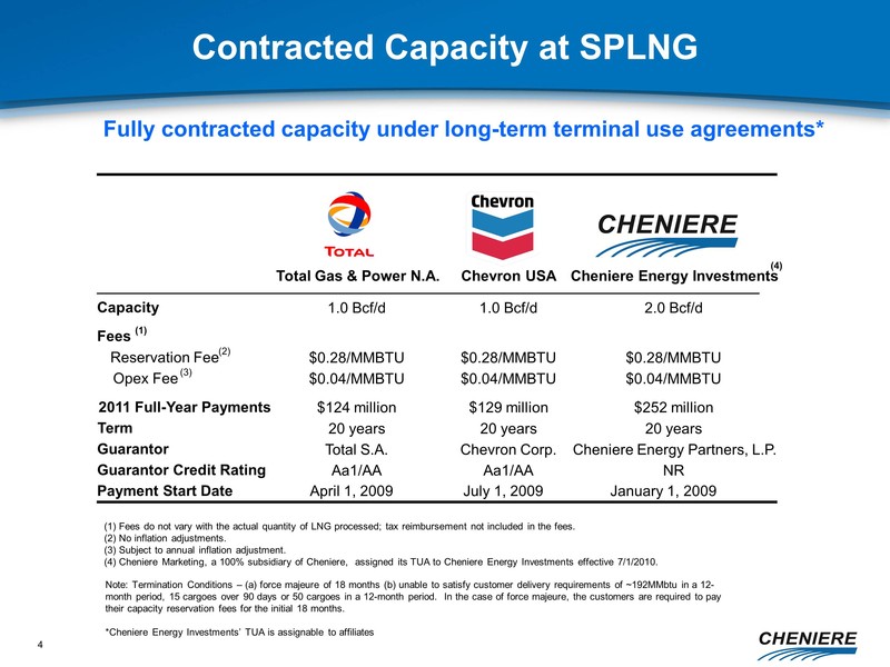 (4) Cheniere Marketing, a 100% subsidiary of Cheniere, assigned its TUA to Cheniere Energy Investments effective 7/1/2010.