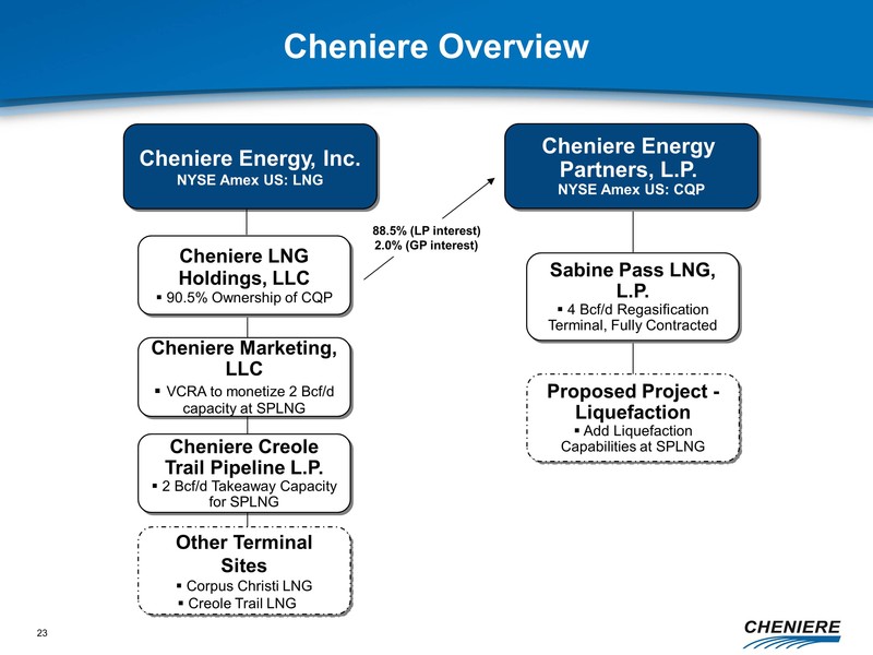 Cheniere is engaged in the development, construction and operation of LNG terminals and pipelines and marketing of LNG and natural gas