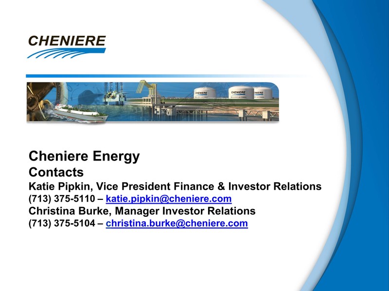 Cheniere Energy Contacts Katie Pipkin, Vice President Finance & Investor Relations (713) 375-5110 – katie.pipkin@cheniere.com Christina Burke, Manager Investor Relations (713) 375-5104 – christina.burke@cheniere.com