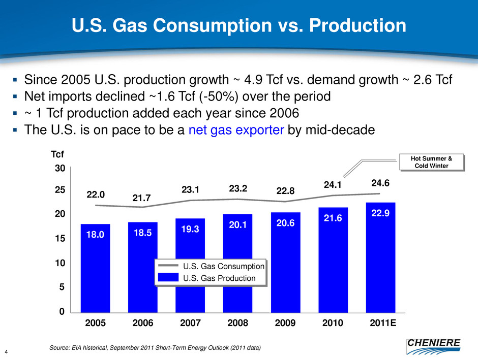 4  : :U.S. Gas Consumption vs. Production  : :Source: EIA historical, September 2011 Short-Term Energy Outlook (2011 data)  : :Hot Summer &  : :Cold Winter  : : Since 2005 U.S. production growth ~ 4.9 Tcf vs. demand growth ~ 2.6 Tcf  : : Net imports declined ~1.6 Tcf (-50%) over the period  : : ~ 1 Tcf production added each year since 2006  : : The U.S. is on pace to be a net gas exporter by mid-decade  : :US Gas Production  : :18.0 18.5  : :19.3 20.1  : :20.6  : :21.6  : :22.9  : :22.0 21.7  : :23.1 23.2 22.8  : :24.1 24.6  : :0  : :5  : :10  : :15  : :20  : :25  : :30  : :2005 2006 2007 2008 2009 2010 2011E  : :Tcf  : :U.S. Gas Consumption  : :U.S. Gas Production  : : : :