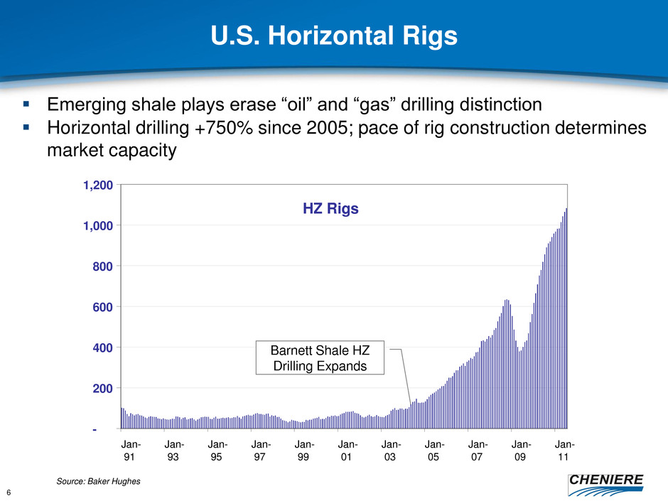 6  : : Emerging shale plays erase “oil” and “gas” drilling distinction  : : Horizontal drilling +750% since 2005; pace of rig construction determines  : :market capacity  : :U.S. Horizontal Rigs  : :Source: Baker Hughes  : :HZ Rigs  : :Barnett Shale HZ  : :Drilling Expands  : :-  : :200  : :400  : :600  : :800  : :1,000  : :1,200  : :Jan-  : :91  : :Jan-  : :93  : :Jan-  : :95  : :Jan-  : :97  : :Jan-  : :99  : :Jan-  : :01  : :Jan-  : :03  : :Jan-  : :05  : :Jan-  : :07  : :Jan-  : :09  : :Jan-  : :11  : : : :