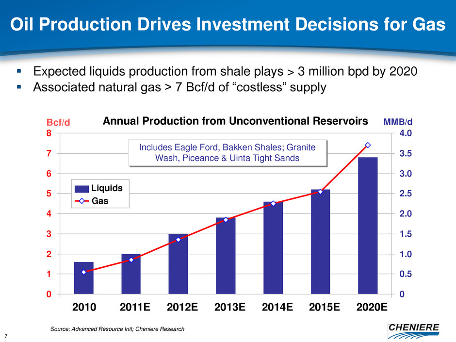 7  : :Oil Production Drives Investment Decisions for Gas  : :Bcf/d MMB/d  : :Source: Advanced Resource Intl; Cheniere Research  : : Expected liquids production from shale plays > 3 million bpd by 2020  : : Associated natural gas > 7 Bcf/d of “costless” supply  : :0  : :1  : :2  : :3  : :4  : :5  : :6  : :7  : :8  : :2010 2011E 2012E 2013E 2014E 2015E 2020E  : :0  : :0.5  : :1.0  : :1.5  : :2.0  : :2.5  : :3.0  : :3.5  : :4.0  : :Includes Eagle Ford, Bakken Shales; Granite  : :Wash, Piceance & Uinta Tight Sands  : :Liquids  : :Gas  : :Annual Production from Unconventional Reservoirs  : : : :