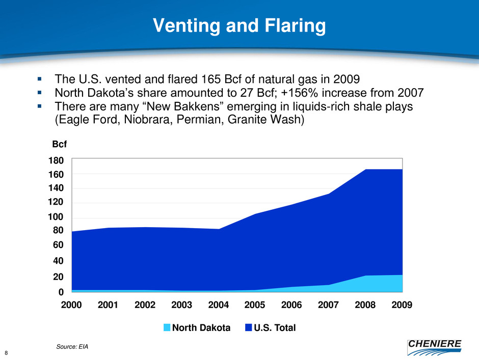 8  : :Venting and Flaring  : : The U.S. vented and flared 165 Bcf of natural gas in 2009  : : North Dakota’s share amounted to 27 Bcf; +156% increase from 2007  : : There are many “New Bakkens” emerging in liquids-rich shale plays  : :(Eagle Ford, Niobrara, Permian, Granite Wash)  : :Source: EIA  : :0  : :20  : :40  : :60  : :80  : :100  : :120  : :140  : :160  : :180  : :2000 2001 2002 2003 2004 2005 2006 2007 2008 2009  : :Bcf  : :North Dakota U.S. Total  : : : :