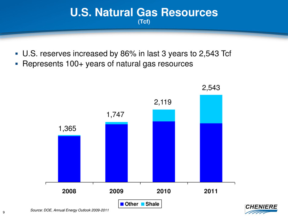 9  : :U.S. Natural Gas Resources  : :(Tcf)  : :Source: DOE, Annual Energy Outlook 2009-2011  : :2008 2009 2010 2011 : : Other Shale : : U.S. reserves increased by 86% in last 3 years to 2,543 Tcf  : : Represents 100+ years of natural gas resources  : :1,365  : :1,747  : :2,119  : :2,543  : : : :