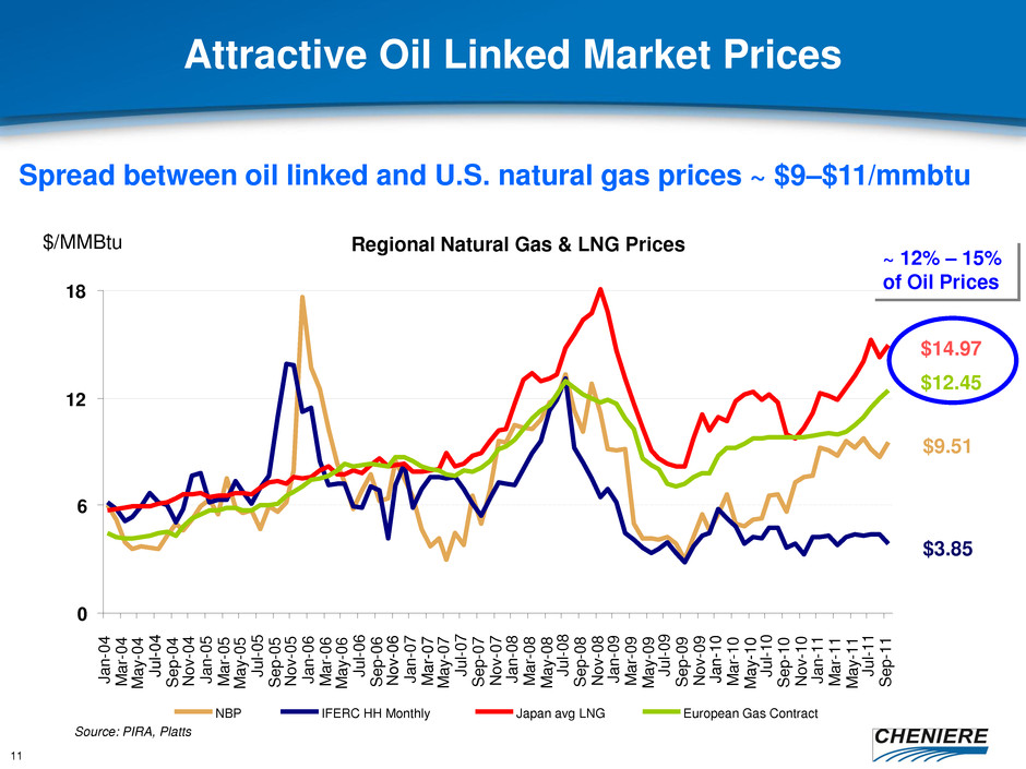 11  : :Attractive Oil Linked Market Prices  : :~ 12% – 15%  : :of Oil Prices  : :Source: PIRA, Platts  : :$3.85  : :$9.51  : :$14.97  : :$12.45  : :Regional Natural Gas & LNG Prices  : :0  : :6  : :12  : :18  : :Ja : : n : : -0 : : 4 : :  : :M : : a : : r- : : 0 : : 4 : :  : :M : : a : : y- : : 0 : : 4 : :  : :J : : u : : l- : : 0 : : 4 : :  : :Se : : p : : -0 : : 4 : :  : :N : : o : : v- : : 0 : : 4 : :  : :Ja : : n : : -0 : : 5 : :  : :M : : a : : r- : : 0 : : 5 : :  : :M : : a : : y- : : 0 : : 5 : :  : :Ju : : l- : : 0 : : 5 : :  : :Se : : p : : -0 : : 5 : :  : :N : : o : : v- : : 0 : : 5 : :  : :Ja : : n : : -0 : : 6 : :  : :M : : a : : r- : : 0 : : 6 : :  : :M : : a : : y- : : 0 : : 6 : :  : :Ju : : l- : : 0 : : 6 : :  : :S : : e : : p : : -0 : : 6 : :  : :N : : o : : v- : : 0 : : 6 : :  : :Ja : : n : : -0 : : 7 : :  : :M : : a : : r- : : 0 : : 7 : :  : :M : : a : : y- : : 0 : : 7 : :  : :Ju : : l- : : 0 : : 7 : :  : :S : : e : : p : : -0 : : 7 : :  : :N : : o : : v- : : 0 : : 7 : :  : :Ja : : n : : -0 : : 8 : :  : :M : : a : : r- : : 0 : : 8 : :  : :M : : a : : y- : : 0 : : 8 : :  : :Ju : : l- : : 0 : : 8 : :  : :S : : e : : p : : -0 : : 8 : :  : :N : : o : : v- : : 0 : : 8 : :  : :Ja : : n : : -0 : : 9 : :  : :M : : a : : r- : : 0 : : 9 : :  : :M : : a : : y- : : 0 : : 9 : :  : :Ju : : l- : : 0 : : 9 : :  : :S : : e : : p : : -0 : : 9 : :  : :N : : o : : v- : : 0 : : 9 : :  : :J : : a : : n : : -1 : : 0 : :  : :M : : a : : r- : : 1 : : 0 : :  : :M : : a : : y- : : 1 : : 0 : :  : :Ju : : l- : : 1 : : 0 : :  : :Se : : p : : -1 : : 0 : :  : :N : : o : : v- : : 1 : : 0 : :  : :Ja : : n : : -1 : : 1 : :  : :M : : a : : r- : : 1 : : 1 : :  : :M : : a : : y- : : 1 : : 1 : :  : :Ju : : l- : : 1 : : 1 : :  : :S : : e : : p : : -1 : : 1 : :  : :$/MMBtu  : :NBP IFERC HH Monthly Japan avg LNG European Gas Contract  : :Spread between oil linked and U.S. natural gas prices ~ $9–$11/mmbtu  : : : :