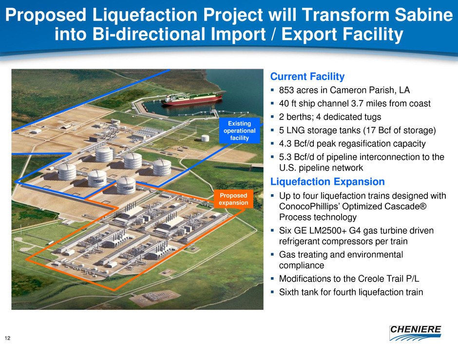 12  : :Proposed Liquefaction Project will Transform Sabine  : :into Bi-directional Import / Export Facility  : :Current Facility  : : 853 acres in Cameron Parish, LA  : : 40 ft ship channel 3.7 miles from coast  : : 2 berths; 4 dedicated tugs  : : 5 LNG storage tanks (17 Bcf of storage)  : : 4.3 Bcf/d peak regasification capacity  : : 5.3 Bcf/d of pipeline interconnection to the  : :U.S. pipeline network  : :Liquefaction Expansion  : : Up to four liquefaction trains designed with  : :ConocoPhillips’ Optimized Cascade®  : :Process technology  : : Six GE LM2500+ G4 gas turbine driven  : :refrigerant compressors per train  : : Gas treating and environmental  : :compliance  : : Modifications to the Creole Trail P/L  : : Sixth tank for fourth liquefaction train  : :Existing  : :operational  : :facility : : Proposed  : :expansion : : : :
