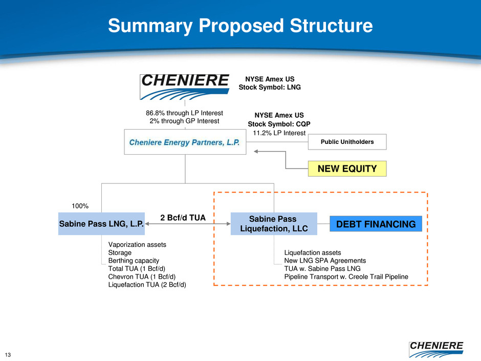 13  : :Summary Proposed Structure  : :Sabine Pass LNG, L.P.  : :  : :  : :  : :  : :86.8% through LP Interest  : :2% through GP Interest  : :NYSE Amex US  : :Stock Symbol: LNG  : :NYSE Amex US  : :Stock Symbol: CQP  : :11.2% LP Interest  : :Public Unitholders  : :Sabine Pass  : :Liquefaction, LLC  : :Vaporization assets  : :Storage  : :Berthing capacity  : :Total TUA (1 Bcf/d)  : :Chevron TUA (1 Bcf/d)  : :Liquefaction TUA (2 Bcf/d)  : :100%  : :  : :Liquefaction assets  : :New LNG SPA Agreements  : :TUA w. Sabine Pass LNG  : :Pipeline Transport w. Creole Trail Pipeline  : : 2 Bcf/d TUA  : :DEBT FINANCING  : :  : :NEW EQUITY  : :  : : : :