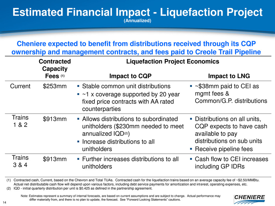 14  : :Estimated Financial Impact - Liquefaction Project  : :(Annualized)  : :Contracted  : :Capacity  : :Fees (1)  : :Liquefaction Project Economics  : :Impact to CQP Impact to LNG  : :Current $253mm Stable common unit distributions  : : ~1 x coverage supported by 20 year  : :fixed price contracts with AA rated  : :counterparties  : : ~$38mm paid to CEI as  : :mgmt fees &  : :Common/G.P. distributions  : :Trains  : :1 & 2  : :  : :$913mm Allows distributions to subordinated  : :unitholders ($230mm needed to meet  : :annualized IQD(2))  : : Increase distributions to all  : :unitholders  : : Distributions on all units,  : :CQP expects to have cash  : :available to pay  : :distributions on sub units  : : Receive pipeline fees  : :Trains  : :3 & 4  : :  : :$913mm Further increases distributions to all  : :unitholders  : : Cash flow to CEI increases  : :including GP IDRs  : :(1) Contracted cash, Current, based on the Chevron and Total TUAs. Contracted cash for the liquefaction trains based on an average capacity fee of ~$2.50/MMBtu.  : :Actual net distributable cash flow will depend upon various factors, including debt service payments for amortization and interest, operating expenses, etc.  : :(2) IQD - initial quarterly distribution per unit is $0.425 as defined in the partnership agreement.  : :Note: Estimates represent a summary of internal forecasts, are based on current assumptions and are subject to change. Actual performance may  : :differ materially from, and there is no plan to update, the forecast. See “Forward Looking Statements” cautions.  : :Cheniere expected to benefit from distributions received through its CQP  : :ownership and management contracts, and fees paid to Creole Trail Pipeline  : : : :