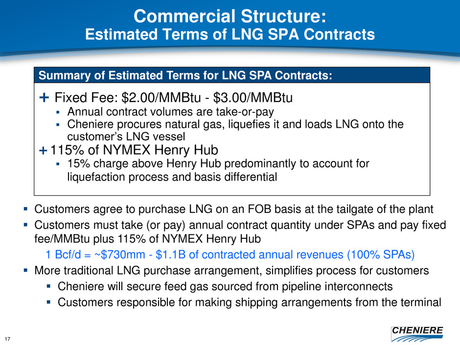 17  : : Fixed Fee: $2.00/MMBtu - $3.00/MMBtu  : : Annual contract volumes are take-or-pay  : : Cheniere procures natural gas, liquefies it and loads LNG onto the  : :customer’s LNG vessel  : :115% of NYMEX Henry Hub  : : 15% charge above Henry Hub predominantly to account for  : :liquefaction process and basis differential  : :Commercial Structure:  : :Estimated Terms of LNG SPA Contracts  : : Customers agree to purchase LNG on an FOB basis at the tailgate of the plant  : : Customers must take (or pay) annual contract quantity under SPAs and pay fixed  : :fee/MMBtu plus 115% of NYMEX Henry Hub  : : 1 Bcf/d = ~$730mm - $1.1B of contracted annual revenues (100% SPAs)  : : More traditional LNG purchase arrangement, simplifies process for customers  : : Cheniere will secure feed gas sourced from pipeline interconnects  : : Customers responsible for making shipping arrangements from the terminal  : :Summary of Estimated Terms for LNG SPA Contracts:  : : : :
