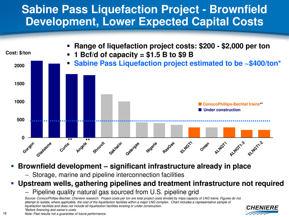 18  : :0 : : 500 : : 1000 : : 1500 : : 2000 : : Go : : rgo : : n : : Gla : : dst : : on : : e : : Cu : : rtis : : An : : gol : : a : : Sh : : no : : vit : : Sak : : hal : : in : : Qa : : tar : : gas : : Nig : : eria : : Ra : : sG : : as : : EL : : NG : : T1 : : Om : : an : : AL : : NG : : T1 : : AL : : NG : : T1- : : 3 : : EL : : NG : : T1- : : 2 : : Sabine Pass Liquefaction Project - Brownfield  : :Development, Lower Expected Capital Costs  : :Source: ConocoPhillips-Bechtel, Cheniere research. Project costs per ton are total project costs divided by mtpa capacity of LNG trains. Figures do not  : :attempt to isolate, where applicable, the cost of the liquefaction facilities within a major LNG complex. Chart includes a representative sample of  : :liquefaction facilities and does not include all liquefaction facilities existing or under construction.  : :*Before financing and owner’s costs  : :Note: Past results not a guarantee of future performance.  : :ConocoPhillips-Bechtel trains**  : :Cost: $/ton  : : Brownfield development – significant infrastructure already in place  : :– Storage, marine and pipeline interconnection facilities  : : Upstream wells, gathering pipelines and treatment infrastructure not required  : :– Pipeline quality natural gas sourced from U.S. pipeline grid  : :Under construction  : :** **  : : Range of liquefaction project costs: $200 - $2,000 per ton  : : 1 Bcf/d of capacity = $1.5 B to $9 B  : : Sabine Pass Liquefaction project estimated to be ~$400/ton*  : : : :