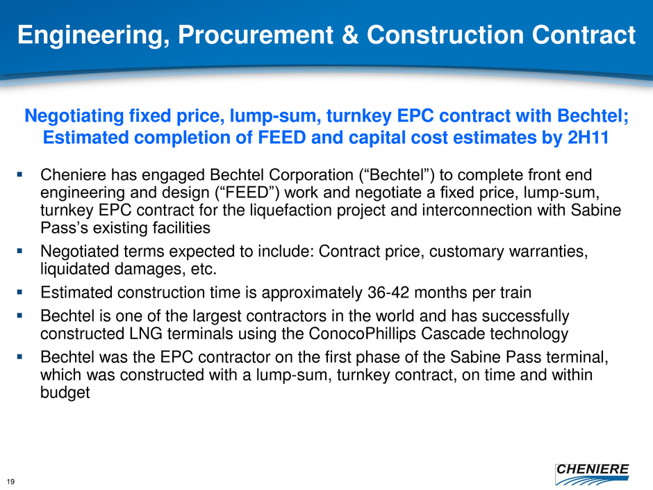 19  : :Engineering, Procurement & Construction Contract  : :  : : Cheniere has engaged Bechtel Corporation (“Bechtel”) to complete front end  : :engineering and design (“FEED”) work and negotiate a fixed price, lump-sum,  : :turnkey EPC contract for the liquefaction project and interconnection with Sabine  : :Pass’s existing facilities  : : Negotiated terms expected to include: Contract price, customary warranties,  : :liquidated damages, etc.  : : Estimated construction time is approximately 36-42 months per train  : : Bechtel is one of the largest contractors in the world and has successfully  : :constructed LNG terminals using the ConocoPhillips Cascade technology  : : Bechtel was the EPC contractor on the first phase of the Sabine Pass terminal,  : :which was constructed with a lump-sum, turnkey contract, on time and within  : :budget  : :Negotiating fixed price, lump-sum, turnkey EPC contract with Bechtel;  : :Estimated completion of FEED and capital cost estimates by 2H11  : : : :