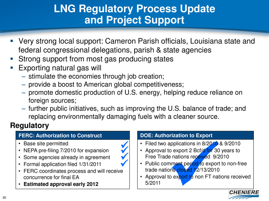 20  : :  : :  : :• Base site permitted  : :• NEPA pre-filing 7/2010 for expansion  : :• Some agencies already in agreement  : :• Formal application filed 1/31/2011  : :• FERC coordinates process and will receive  : :concurrence for final EA  : :• Estimated approval early 2012  : :  : :  : :  : :  : :LNG Regulatory Process Update  : :and Project Support  : : Very strong local support: Cameron Parish officials, Louisiana state and  : :federal congressional delegations, parish & state agencies  : : Strong support from most gas producing states  : : Exporting natural gas will  : :– stimulate the economies through job creation;  : :– provide a boost to American global competitiveness;  : :– promote domestic production of U.S. energy, helping reduce reliance on  : :foreign sources;  : :– further public initiatives, such as improving the U.S. balance of trade; and  : :replacing environmentally damaging fuels with a cleaner source.  : :Regulatory  : :  : :  : :  : :FERC: Authorization to Construct DOE: Authorization to Export  : :  : :  : :• Filed two applications in 8/2010 & 9/2010  : :• Approval to export 2 Bcf/d for 30 years to  : :Free Trade nations received 9/2010  : :• Public comment period to export to non-free  : :trade nations closed 12/13/2010  : :• Approval to export to non FT nations received  : :5/2011  : : : :