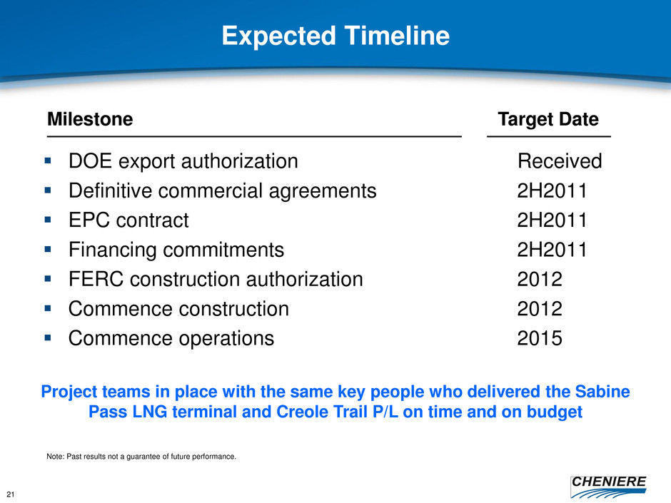 21  : :Expected Timeline  : : DOE export authorization Received  : : Definitive commercial agreements 2H2011  : : EPC contract 2H2011  : : Financing commitments 2H2011  : : FERC construction authorization 2012  : : Commence construction 2012  : : Commence operations 2015  : :Milestone Target Date  : :Note: Past results not a guarantee of future performance.  : :Project teams in place with the same key people who delivered the Sabine  : :Pass LNG terminal and Creole Trail P/L on time and on budget  : : : :