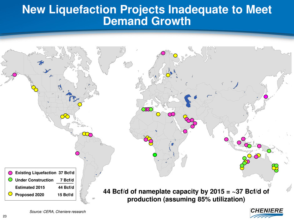 23  : :New Liquefaction Projects Inadequate to Meet  : :Demand Growth  : :Source: CERA, Cheniere research  : :Existing Liquefaction 37 Bcf/d  : :Under Construction 7 Bcf/d  : :Proposed 2020 15 Bcf/d  : :Estimated 2015 44 Bcf/d  : :44 Bcf/d of nameplate capacity by 2015 = ~37 Bcf/d of  : :production (assuming 85% utilization)  : : : :