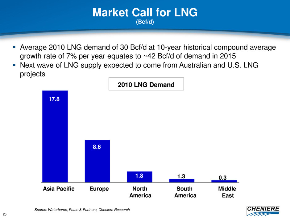 25  : :Market Call for LNG  : :(Bcf/d)  : : Average 2010 LNG demand of 30 Bcf/d at 10-year historical compound average  : :growth rate of 7% per year equates to ~42 Bcf/d of demand in 2015  : : Next wave of LNG supply expected to come from Australian and U.S. LNG  : :projects  : :17.8  : : 8.6  : : 1.8 1.3 0.3  : :Asia Pacific Europe North  : :America  : :South  : :America  : :Middle  : :East  : :2010 LNG Demand  : :Source: Waterborne, Poten & Partners, Cheniere Research  : : : :