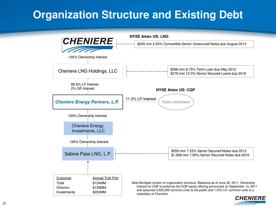 27  : :11.2% LP Interest  : :Organization Structure and Existing Debt  : :Cheniere Energy  : :Investments, LLC  : :100% Ownership Interest  : :  : :100% Ownership Interest  : :Cheniere LNG Holdings, LLC  : :  : :  : :  : :$205 mm 2.25% Convertible Senior Unsecured Notes due August 2012  : :  : :$550 mm 7.25% Senior Secured Notes due 2013  : :$1,666 mm 7.50% Senior Secured Notes due 2016  : :  : :86.8% LP Interest  : :2% GP Interest  : :NYSE Amex US: LNG  : :NYSE Amex US: CQP  : :3  : :$298 mm 9.75% Term Loan due May 2012  : :$278 mm 12.0% Senior Secured Loans due 2018  : :Note:Abridged version of organization structure. Balances as of June 30, 2011. Ownership  : :interest for CQP is proforma the CQP equity offering announced on September 13, 2011  : :and assumes 3,000,000 common units to the public and 1,072,131 common units to a  : :subsidiary of Cheniere.  : :Customer Annual TUA Pmt  : :Total $124MM  : :Chevron $129MM  : :Investments $252MM  : :Sabine Pass LNG, L.P.  : :100% Ownership Interest  : :Public Unitholders  : : : :