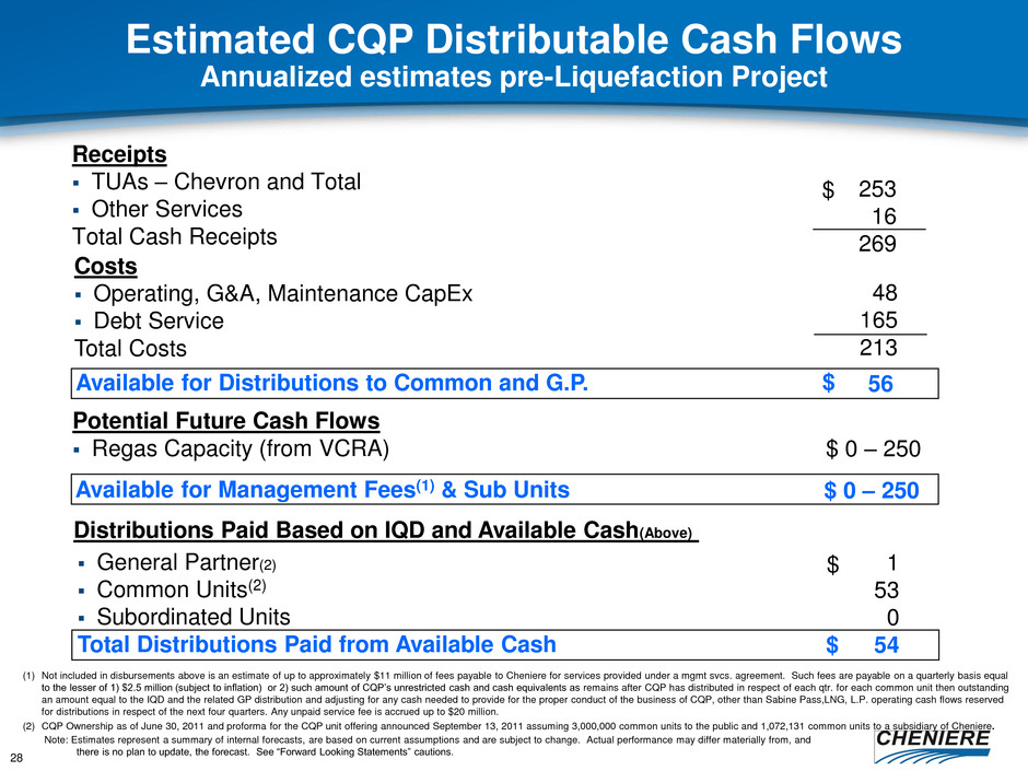 28  : :$  : :$  : : $ 0 – 250  : :Estimated CQP Distributable Cash Flows  : :Annualized estimates pre-Liquefaction Project  : :Receipts  : : TUAs – Chevron and Total  : : Other Services  : :Total Cash Receipts  : :Note: Estimates represent a summary of internal forecasts, are based on current assumptions and are subject to change. Actual performance may differ materially from, and  : :there is no plan to update, the forecast. See “Forward Looking Statements” cautions.  : :Available for Distributions to Common and G.P.  : :(1) Not included in disbursements above is an estimate of up to approximately $11 million of fees payable to Cheniere for services provided under a mgmt svcs. agreement. Such fees are payable on a quarterly basis equal  : :to the lesser of 1) $2.5 million (subject to inflation) or 2) such amount of CQP’s unrestricted cash and cash equivalents as remains after CQP has distributed in respect of each qtr. for each common unit then outstanding  : :an amount equal to the IQD and the related GP distribution and adjusting for any cash needed to provide for the proper conduct of the business of CQP, other than Sabine Pass,LNG, L.P. operating cash flows reserved  : :for distributions in respect of the next four quarters. Any unpaid service fee is accrued up to $20 million.  : :(2) CQP Ownership as of June 30, 2011 and proforma for the CQP unit offering announced September 13, 2011 assuming 3,000,000 common units to the public and 1,072,131 common units to a subsidiary of Cheniere. : :  : :Available for Management Fees(1) & Sub Units  : :253  : :16  : :269  : :  : :1  : :53  : :0  : :54  : :Potential Future Cash Flows  : : Regas Capacity (from VCRA)  : :56 : : $  : :$ 0 – 250  : : General Partner(2)  : : Common Units(2)  : : Subordinated Units  : :Total Distributions Paid from Available Cash  : :Distributions Paid Based on IQD and Available Cash(Above)  : :Costs  : : Operating, G&A, Maintenance CapEx  : : Debt Service  : :Total Costs  : :48  : :165  : :213  : :$  : : : :