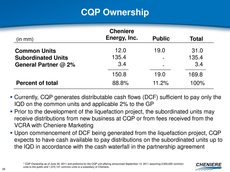 29  : :CQP Ownership  : :Common Units  : :Subordinated Units  : :General Partner @ 2%  : :19.0 12.0  : :135.4  : :3.4  : :Public  : :Cheniere  : :Energy, Inc.  : :19.0 150.8  : :(in mm)  : :31.0  : :135.4  : :3.4  : :169.8  : :Total  : :88.8% 11.2% 100% Percent of total  : :* CQP Ownership as of June 30, 2011 and proforma for the CQP unit offering announced September 13, 2011 assuming 3,000,000 common  : :units to the public and 1,072,131 common units to a subsidiary of Cheniere.  : : -  : : -  : : Currently, CQP generates distributable cash flows (DCF) sufficient to pay only the  : :IQD on the common units and applicable 2% to the GP  : : Prior to the development of the liquefaction project, the subordinated units may  : :receive distributions from new business at CQP or from fees received from the  : :VCRA with Cheniere Marketing  : : Upon commencement of DCF being generated from the liquefaction project, CQP  : :expects to have cash available to pay distributions on the subordinated units up to  : :the IQD in accordance with the cash waterfall in the partnership agreement  : : : :