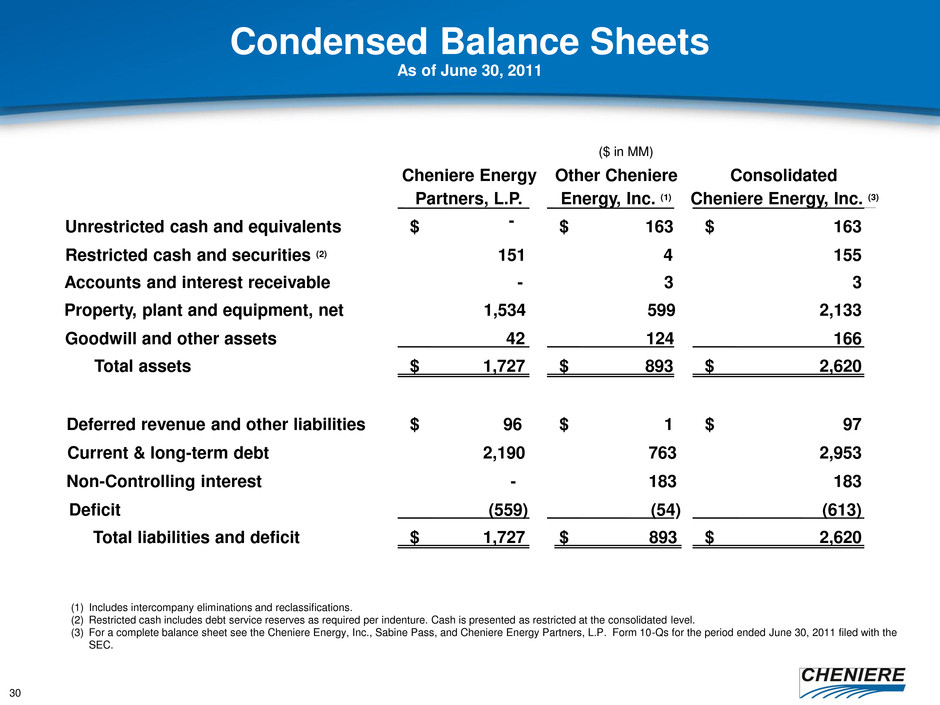 30  : :Condensed Balance Sheets  : :As of June 30, 2011  : :Cheniere Energy Other Cheniere Consolidated  : :Partners, L.P. Energy, Inc. (1) Cheniere Energy, Inc. (3)  : :Unrestricted cash and equivalents $ - 163 $ 163 $  : :Restricted cash and securities (2) 151 4 155  : :Property, plant and equipment, net 1,534 599 2,133  : :Goodwill and other assets 42 124 166  : : Total assets 1,727 $ 893 $ 2,620 $  : :Deferred revenue and other liabilities 96 $ 1 $ 97 $  : :Current & long-term debt 2,190 763 2,953  : :Non-Controlling interest - 183 183  : :Deficit (559) (54) (613)  : :1,727 $ 893 $ 2,620 $  : :(1) Includes intercompany eliminations and reclassifications.  : :(2) Restricted cash includes debt service reserves as required per indenture. Cash is presented as restricted at the consolidated level.  : :(3) For a complete balance sheet see the Cheniere Energy, Inc., Sabine Pass, and Cheniere Energy Partners, L.P. Form 10-Qs for the period ended June 30, 2011 filed with the  : :SEC.  : :-  : :Accounts and interest receivable - 3 3  : : Total liabilities and deficit  : :($ in MM)  : : : :