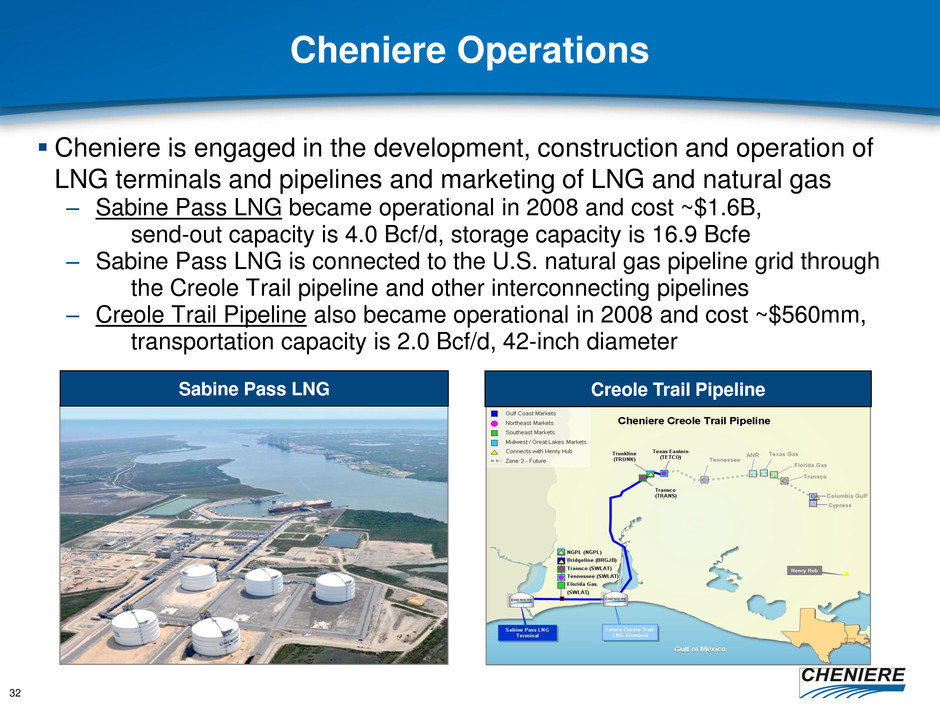 32  : :Cheniere Operations  : : Cheniere is engaged in the development, construction and operation of  : :LNG terminals and pipelines and marketing of LNG and natural gas  : :– Sabine Pass LNG became operational in 2008 and cost ~$1.6B,  : : send-out capacity is 4.0 Bcf/d, storage capacity is 16.9 Bcfe  : :– Sabine Pass LNG is connected to the U.S. natural gas pipeline grid through  : : the Creole Trail pipeline and other interconnecting pipelines  : :– Creole Trail Pipeline also became operational in 2008 and cost ~$560mm,  : : transportation capacity is 2.0 Bcf/d, 42-inch diameter  : :Sabine Pass LNG Creole Trail Pipeline  : : : :