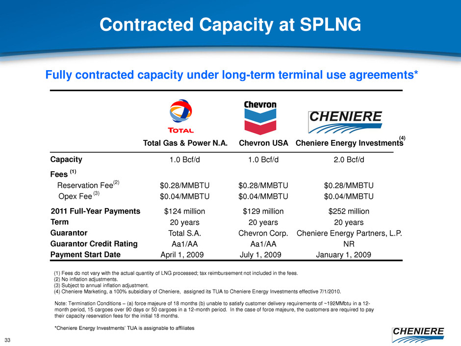 33  : :Contracted Capacity at SPLNG  : :  : :  : :Fully contracted capacity under long-term terminal use agreements*  : :Total Gas & Power N.A. Chevron USA Cheniere Energy Investments  : :Capacity 1.0 Bcf/d 1.0 Bcf/d 2.0 Bcf/d  : :Fees (1)  : :Reservation Fee  : :(2)  : :$0.28/MMBTU $0.28/MMBTU $0.28/MMBTU  : :Opex Fee  : :(3)  : :$0.04/MMBTU $0.04/MMBTU $0.04/MMBTU  : :2011 Full-Year Payments $124 million $129 million $252 million  : :Term 20 years 20 years 20 years  : :Guarantor Total S.A. Chevron Corp. Cheniere Energy Partners, L.P.  : :Guarantor Credit Rating Aa1/AA Aa1/AA NR  : :Payment Start Date April 1, 2009 July 1, 2009 January 1, 2009  : :(4)  : :(1) Fees do not vary with the actual quantity of LNG processed; tax reimbursement not included in the fees.  : :(2) No inflation adjustments.  : :(3) Subject to annual inflation adjustment.  : :(4) Cheniere Marketing, a 100% subsidiary of Cheniere, assigned its TUA to Cheniere Energy Investments effective 7/1/2010.  : :Note: Termination Conditions – (a) force majeure of 18 months (b) unable to satisfy customer delivery requirements of ~192MMbtu in a 12- : : month period, 15 cargoes over 90 days or 50 cargoes in a 12-month period. In the case of force majeure, the customers are required to pay  : :their capacity reservation fees for the initial 18 months.  : :  : :*Cheniere Energy Investments’ TUA is assignable to affiliates  : : : :