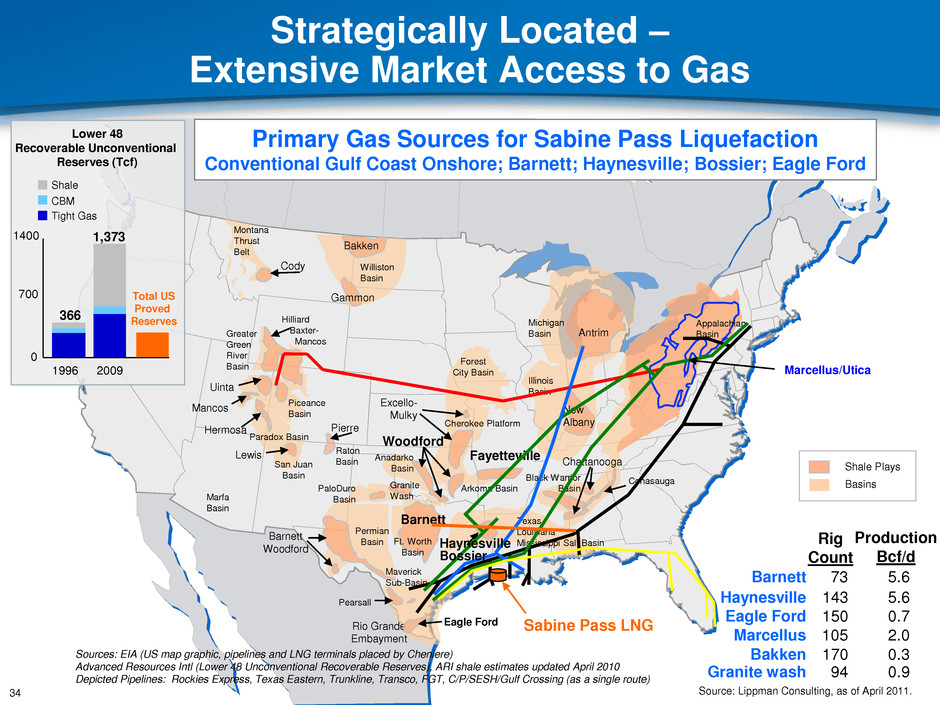34  : :Strategically Located –  : :Extensive Market Access to Gas  : :Montana  : :Thrust  : :Belt  : :Cody  : :Gammon  : :Hilliard  : : Baxter-  : : Mancos  : :Greater  : :Green  : :River  : :Basin  : :Forest  : :City Basin  : :Pierre  : :Illinois  : :Basin  : :Piceance  : :Basin  : :Lewis  : :San Juan  : :Basin  : :Raton  : :Basin Anadarko  : :Basin  : :PaloDuro  : :Basin  : :Permian  : :Basin  : :Barnett  : :Woodford  : :Pearsall  : :Eagle Ford Rio Grande  : :Embayment  : :Barnett  : :Woodford  : :Michigan  : :Basin Antrim  : :New  : :Albany  : :Chattanooga  : :Texas  : :Louisiana  : :Mississippi Salt Basin  : :Fayetteville  : :Ft. Worth  : :Basin  : :Arkoma Basin  : :Conasauga Black Warrior  : :Basin  : :Marfa  : :Basin  : :Paradox Basin  : :Maverick  : :Sub-Basin  : :Hermosa  : :Mancos  : :Cherokee Platform  : :Excello-  : :Mulky  : :Appalachian  : :Basin  : :Marcellus/Utica  : :Shale Plays  : :Basins  : :  : :366  : :1,373  : :Lower 48  : :Recoverable Unconventional  : :Reserves (Tcf)  : :0  : :700  : :1400  : :1996 2009  : :Shale  : :CBM  : :Tight Gas  : :Total US  : :Proved  : :Reserves  : :Sabine Pass LNG  : :Haynesville  : :Bossier  : :Granite  : :Wash  : :Williston  : :Basin  : :Bakken  : :Primary Gas Sources for Sabine Pass Liquefaction  : :Conventional Gulf Coast Onshore; Barnett; Haynesville; Bossier; Eagle Ford  : :Sources: EIA (US map graphic, pipelines and LNG terminals placed by Cheniere)  : :Advanced Resources Intl (Lower 48 Unconventional Recoverable Reserves), ARI shale estimates updated April 2010  : :Depicted Pipelines: Rockies Express, Texas Eastern, Trunkline, Transco, FGT, C/P/SESH/Gulf Crossing (as a single route)  : :Rig  : :Count  : :Production  : :Bcf/d  : :Barnett 73 5.6  : :Haynesville 143 5.6  : :Eagle Ford 150 0.7  : :Granite wash 94 0.9  : :Bakken 170 0.3  : :Marcellus 105 2.0  : :Source: Lippman Consulting, as of April 2011.  : :Uinta  : : : :