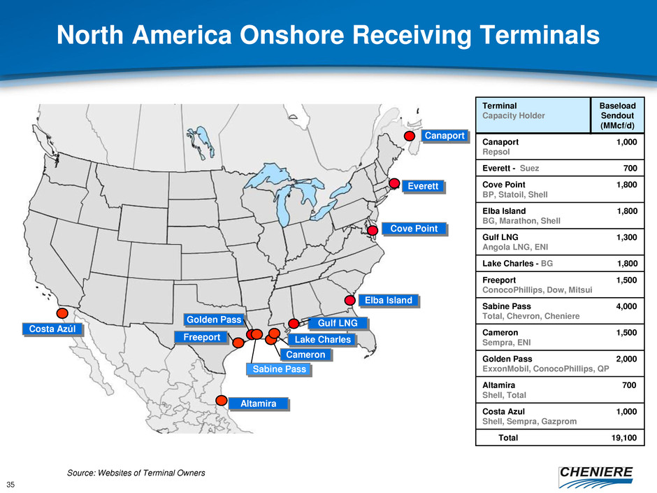 35  : :Everett  : :Cove Point  : :Elba Island  : : Lake Charles  : : Sabine Pass  : : Freeport  : :Golden Pass  : :Cameron  : :Costa Azúl  : :Canaport  : :Altamira  : :Source: Websites of Terminal Owners  : :Terminal  : :Capacity Holder  : :Baseload  : :Sendout  : :(MMcf/d)  : :Canaport 1,000  : :Repsol  : :Everett - Suez 700  : :Cove Point 1,800  : :BP, Statoil, Shell  : :Elba Island 1,800  : :BG, Marathon, Shell  : :Gulf LNG 1,300  : :Angola LNG, ENI  : :Lake Charles - BG 1,800  : :Freeport 1,500  : :ConocoPhillips, Dow, Mitsui  : :Sabine Pass 4,000  : :Total, Chevron, Cheniere  : :Cameron 1,500  : :Sempra, ENI  : :Golden Pass 2,000  : :ExxonMobil, ConocoPhillips, QP  : :Altamira 700  : :Shell, Total  : :Costa Azul 1,000  : :Shell, Sempra, Gazprom  : : Total 19,100  : :North America Onshore Receiving Terminals  : :Gulf LNG  : : : :