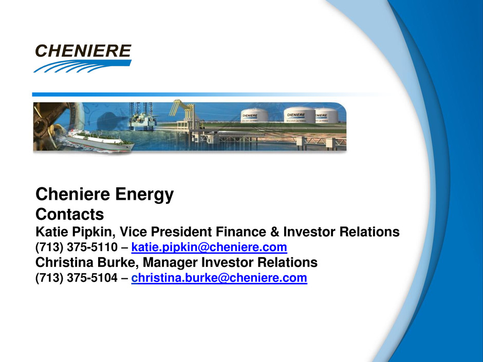 : :  : :  : :Cheniere Energy  : :Contacts  : :Katie Pipkin, Vice President Finance & Investor Relations  : :(713) 375-5110 – katie.pipkin@cheniere.com  : :Christina Burke, Manager Investor Relations  : :(713) 375-5104 – christina.burke@cheniere.com  : :  : :CHENIERE ENERGY  : : : :