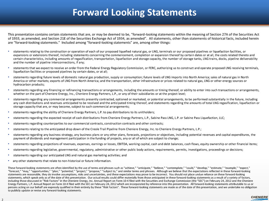 Forward Looking Statements 2 This presentation contains certain statements that are, or may be deemed to be, “forward-looking statements within the meaning of Section 27A of the Securities Act of 1933, as amended, and Section 21E of the Securities Exchange Act of 1934, as amended”. All statements, other than statements of historical facts, included herein are “forward-looking statements.” Included among “forward-looking statements” are, among other things: • statements relating to the construction or operation of each of our proposed liquefied natural gas, or LNG, terminals or our proposed pipelines or liquefaction facilities, or expansions or extensions thereof, including statements concerning the commencement, completion or expansion thereof by certain dates or at all, the costs related thereto and certain characteristics, including amounts of regasification, transportation, liquefaction and storage capacity, the number of storage tanks, LNG trains, docks, pipeline deliverability and the number of pipeline interconnections, if any; • statements that we expect to receive an order from the Federal Energy Regulatory Commission, or FERC, authorizing us to construct and operate proposed LNG receiving terminals, liquefaction facilities or proposed pipelines by certain dates, or at all; • statements regarding future levels of domestic natural gas production, supply or consumption; future levels of LNG imports into North America; sales of natural gas in North America or other markets; exports of LNG from North America; and the transportation, other infrastructure or prices related to natural gas, LNG or other energy sources or hydrocarbon products; • statements regarding any financing or refinancing transactions or arrangements, including the amounts or timing thereof, or ability to enter into such transactions or arrangements, whether on the part of Cheniere Energy, Inc., Cheniere Energy Partners, L.P., or any of their subsidiaries or at the project level; • statements regarding any commercial arrangements presently contracted, optioned or marketed, or potential arrangements, to be performed substantially in the future, including any cash distributions and revenues anticipated to be received and the anticipated timing thereof, and statements regarding the amounts of total LNG regasification, liquefaction or storage capacity that are, or may become, subject to such commercial arrangements; • statements regarding the ability of Cheniere Energy Partners, L.P. to pay distributions to its unitholders; • statements regarding the expected receipt of cash distributions from Cheniere Energy Partners, L.P., Sabine Pass LNG, L.P. or Sabine Pass Liquefaction, LLC; • statements regarding counterparties to our commercial contracts, construction contracts and other contracts; • statements relating to the anticipated drop down of the Creole Trail Pipeline from Cheniere Energy, Inc. to Cheniere Energy Partners, L.P.; • statements regarding any business strategy, any business plans or any other plans, forecasts, projections or objectives, including potential revenues and capital expenditures, the payment of dividends and management participation in the funding of projects, any or all of which are subject to change; • statements regarding projections of revenues, expenses, earnings or losses, EBITDA, working capital, cash and debt balances, cash flows, equity ownership or other financial items; • statements regarding legislative, governmental, regulatory, administrative or other public body actions, requirements, permits, investigations, proceedings or decisions; • statements regarding our anticipated LNG and natural gas marketing activities; and • any other statements that relate to non-historical or future information. These forward-looking statements are often identified by the use of terms and phrases such as “achieve,” “anticipate,” “believe,” “contemplate,” “could,” “develop,” “estimate,” “example,” “expect,” “forecast,” “may,” “opportunities,” “plan,” “potential,” “project,” “propose,” “subject to,” and similar terms and phrases. Although we believe that the expectations reflected in these forward-looking statements are reasonable, they do involve assumptions, risks and uncertainties, and these expectations may prove to be incorrect. You should not place undue reliance on these forward-looking statements, which speak only as of the date of this presentation. Our actual results could differ materially from those anticipated in these forward-looking statements as a result of a variety of factors, including those discussed in “Risk Factors” in the Cheniere Energy, Inc. Annual Report on Form 10-K filed with the Securities and Exchange Commission (the “SEC”) on February 24, 2012 and the Cheniere Energy Partners, L.P. Annual Report on Form 10-K filed with the SEC on February 24, 2012 which are incorporated by reference into this presentation. All forward-looking statements attributable to us or persons acting on our behalf are expressly qualified in their entirety by these ”Risk Factors”. These forward-looking statements are made as of the date of this presentation, and we undertake no obligation to publicly update or revise any forward-looking statements.