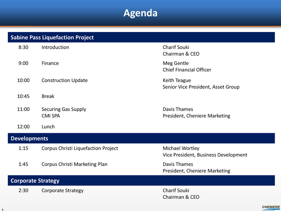 Agenda Sabine Pass Liquefaction Project 8:30 Introduction Charif Souki Chairman & CEO 9:00 Finance Meg Gentle Chief Financial Officer 10:00 Construction Update Keith Teague Senior Vice President, Asset Group 10:45 Break 11:00 Securing Gas Supply CMI SPA Davis Thames President, Cheniere Marketing 12:00 Lunch Developments 1:15 Corpus Christi Liquefaction Project Michael Wortley Vice President, Business Development 1:45 Corpus Christi Marketing Plan Davis Thames President, Cheniere Marketing Corporate Strategy 2:30 Corporate Strategy Charif Souki Chairman & CEO 4