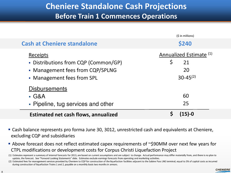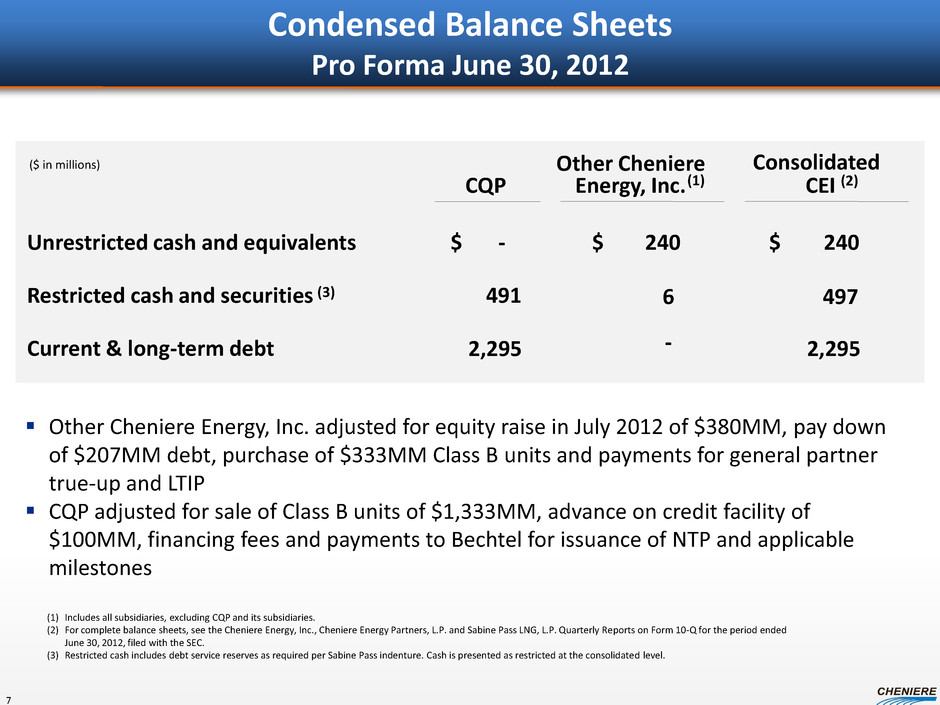 Condensed Balance Sheets Pro Forma June 30, 2012 Other Cheniere Consolidated CQP Energy, Inc. CEI (2) Unrestricted cash and equivalents $ - 240 $ 240 $ Restricted cash and securities 491 Current & long-term debt 2,295 2,295 (1) Includes all subsidiaries, excluding CQP and its subsidiaries. (2) For complete balance sheets, see the Cheniere Energy, Inc., Cheniere Energy Partners, L.P. and Sabine Pass LNG, L.P. Quarterly Reports on Form 10-Q for the period ended June 30, 2012, filed with the SEC. (3) Restricted cash includes debt service reserves as required per Sabine Pass indenture. Cash is presented as restricted at the consolidated level. ($ in millions) (3) 6 - 497 Other Cheniere Energy, Inc. adjusted for equity raise in July 2012 of $380MM, pay down of $207MM debt, purchase of $333MM Class B units and payments for general partner true-up and LTIP CQP adjusted for sale of Class B units of $1,333MM, advance on credit facility of $100MM, financing fees and payments to Bechtel for issuance of NTP and applicable milestones (1) 7