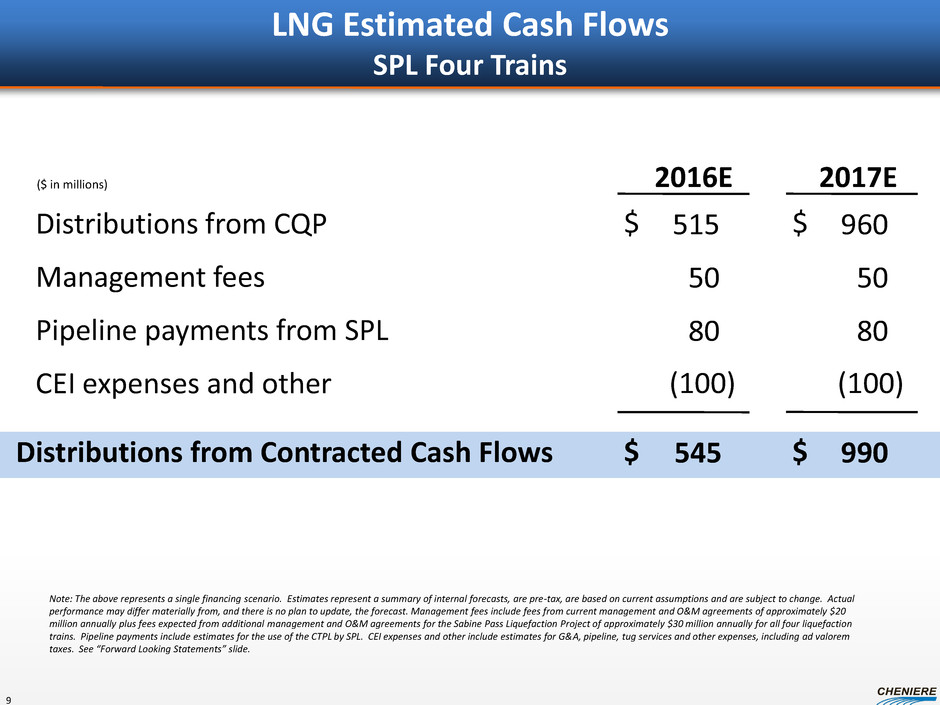 Disbursements G&A Pipeline, tug services and other Cheniere Standalone Cash Projections Before Train 1 Commences Operations Receipts Distributions from CQP (Common/GP) Management fees from CQP/SPLNG Management fees from SPL (15)-0 (1) Estimates represent a summary of internal forecasts for 2013, are based on current assumptions and are subject to change. Actual performance may differ materially from, and there is no plan to update, the forecast. See “Forward Looking Statements” slide. Estimates exclude earnings forecasts from operating and marketing activities. (2) Estimated fees for management services provided by Cheniere to CQP for construction of the liquefaction facilities adjacent to the Sabine Pass LNG terminal, equal to 3% of capital costs as incurred during construction of liquefaction Trains 1 and 2, payable on a monthly basis two months in arrears. Estimated net cash flows, annualized 21 20 30-45(2) 60 25 $ Cash at Cheniere standalone $240 Annualized Estimate (1) Cash balance represents pro forma June 30, 3012, unrestricted cash and equivalents at Cheniere, excluding CQP and subsidiaries Above forecast does not reflect estimated capex requirements of ~$90MM over next few years for CTPL modifications or development costs for Corpus Christi Liquefaction Project $ ($ in millions) 8