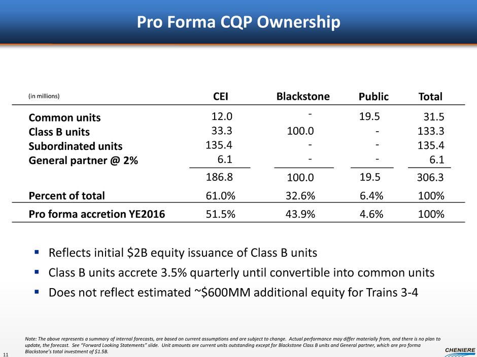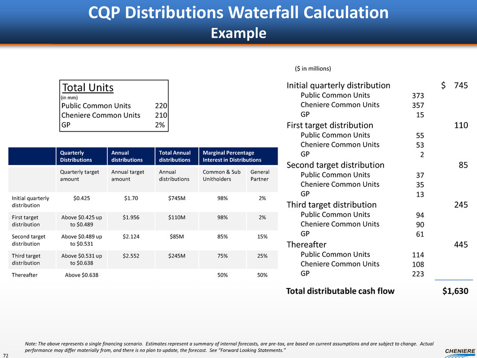CQP Distributions Waterfall Calculation Example Quarterly Distributions Annual distributions Total Annual distributions Marginal Percentage Interest in Distributions Quarterly target amount Annual target amount Annual distributions Common & Sub Unitholders General Partner Initial quarterly distribution $0.425 $1.70 $745M 98% 2% First target distribution Above $0.425 up to $0.489 $1.956 $110M 98% 2% Second target distribution Above $0.489 up to $0.531 $2.124 $85M 85% 15% Third target distribution Above $0.531 up to $0.638 $2.552 $245M 75% 25% Thereafter Above $0.638 50% 50% Total distributable cash flow $1,630 Initial quarterly distribution First target distribution Second target distribution Third target distribution Thereafter $ 745 110 85 245 445 Total Units (in mm) Public Common Units 220 Cheniere Common Units 210 GP 2% Public Common Units Cheniere Common Units GP Public Common Units Cheniere Common Units GP Public Common Units Cheniere Common Units GP Public Common Units Cheniere Common Units GP Public Common Units Cheniere Common Units GP 373 357 15 55 53 2 37 35 13 94 90 61 114 108 223 Note: The above represents a single financing scenario. Estimates represent a summary of internal forecasts, are pre-tax, are based on current assumptions and are subject to change. Actual performance may differ materially from, and there is no plan to update, the forecast. See “Forward Looking Statements.” ($ in millions) 72