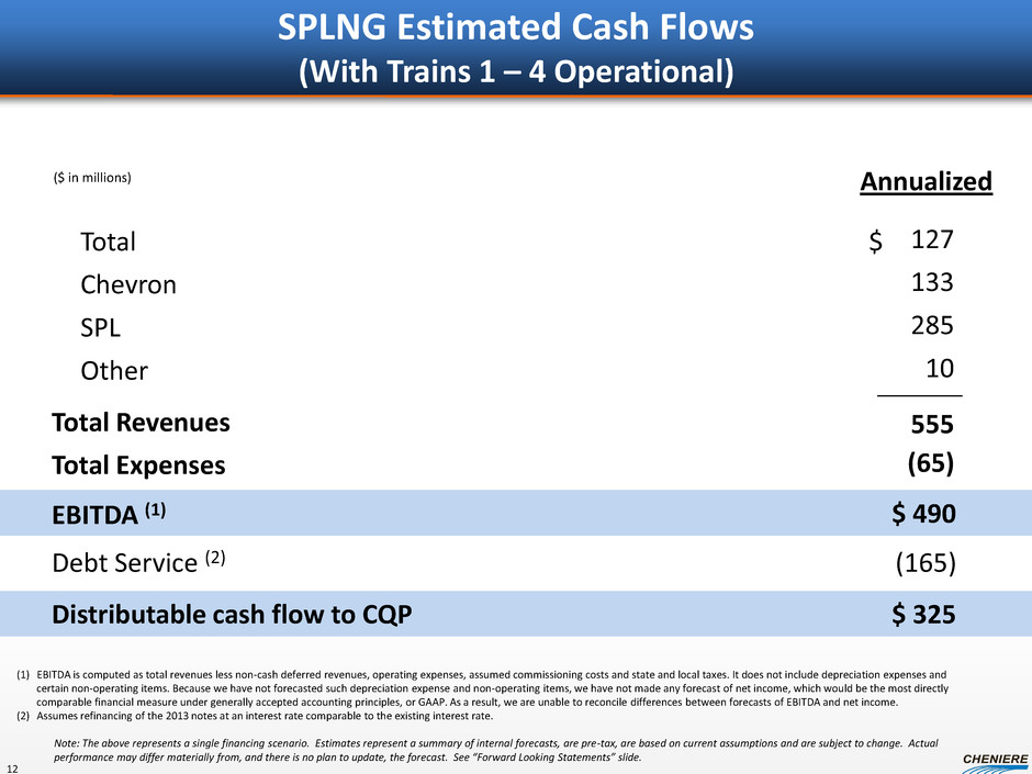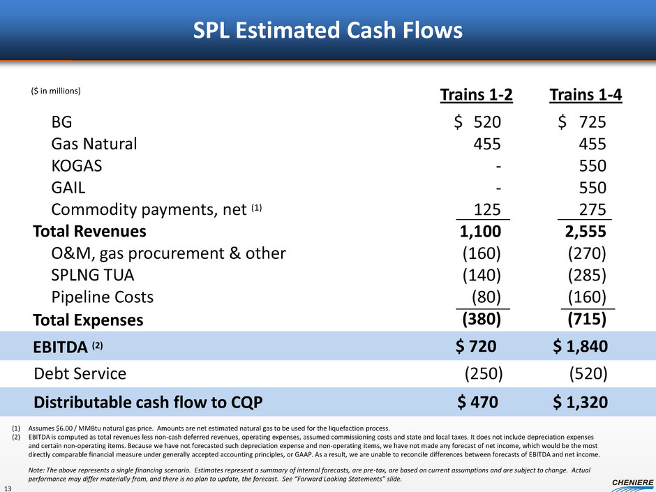 SPLNG Estimated Cash Flows (With Trains 1 – 4 Operational) Total Revenues Total Expenses Total Chevron SPL Other EBITDA (1) 127 133 285 10 555 (65) $ 490 $ Distributable cash flow to CQP $ 325 ($ in millions) Debt Service (2) (165) Annualized (1) EBITDA is computed as total revenues less non-cash deferred revenues, operating expenses, assumed commissioning costs and state and local taxes. It does not include depreciation expenses and certain non-operating items. Because we have not forecasted such depreciation expense and non-operating items, we have not made any forecast of net income, which would be the most directly comparable financial measure under generally accepted accounting principles, or GAAP. As a result, we are unable to reconcile differences between forecasts of EBITDA and net income. (2) Assumes refinancing of the 2013 notes at an interest rate comparable to the existing interest rate. Note: The above represents a single financing scenario. Estimates represent a summary of internal forecasts, are pre-tax, are based on current assumptions and are subject to change. Actual performance may differ materially from, and there is no plan to update, the forecast. See “Forward Looking Statements” slide. 12