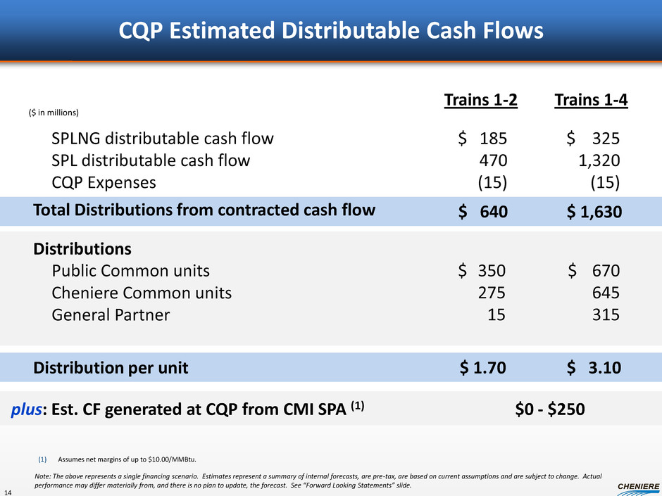 SPL Estimated Cash Flows Trains 1-4 Total Revenues Trains 1-2 BG Gas Natural KOGAS GAIL Commodity payments, net (1) O&M, gas procurement & other SPLNG TUA Pipeline Costs 520 455 - - 125 1,100 (160) (140) (80) (380) EBITDA (2) 725 455 550 550 275 2,555 (270) (285) (160) (715) $ 1,840 $ 720 $ $ Distributable cash flow to CQP $ 1,320 ($ in millions) $ 470 Debt Service (520) (250) Total Expenses (1) Assumes $6.00 / MMBtu natural gas price. Amounts are net estimated natural gas to be used for the liquefaction process. (2) EBITDA is computed as total revenues less non-cash deferred revenues, operating expenses, assumed commissioning costs and state and local taxes. It does not include depreciation expenses and certain non-operating items. Because we have not forecasted such depreciation expense and non-operating items, we have not made any forecast of net income, which would be the most directly comparable financial measure under generally accepted accounting principles, or GAAP. As a result, we are unable to reconcile differences between forecasts of EBITDA and net income. Note: The above represents a single financing scenario. Estimates represent a summary of internal forecasts, are pre-tax, are based on current assumptions and are subject to change. Actual performance may differ materially from, and there is no plan to update, the forecast. See “Forward Looking Statements” slide. 13