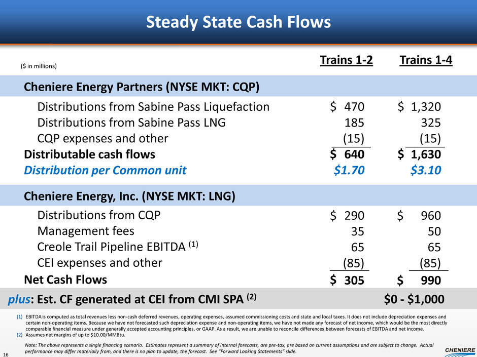 Current Facility Delivery from SPLNG: 2.0 Bcf/d Diameter: 42-inch; Length: 94 miles Interconnects: NGPL, Transco, TGPL, FGT, Bridgeline, Tetco, Trunkline Pipeline Modifications Reconfigure for bi-directional flow One new compressor station with three new units Two new meter stations Modify existing meter stations Est ~$90MM capital cost Est delivery to SPLNG: 1.5 Bcf/d Est in-service: 4Q2014 – 4Q2015 Creole Trail Pipeline CTPL expected to be modified for bi-directional flow to source natural gas supply for SPL ~$90MM of capex for ~$65MM of annual EBITDA CQP expected to purchase CTPL in due course 15