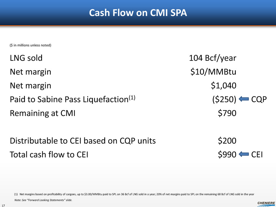 Steady State Cash Flows Trains 1-4 Distributable cash flows Distribution per Common unit Trains 1-2 Distributions from Sabine Pass Liquefaction Distributions from Sabine Pass LNG CQP expenses and other 470 185 (15) 640 $1.70 Cheniere Energy Partners (NYSE MKT: CQP) 1,320 325 (15) 1,630 $3.10 $ $ ($ in millions) Net Cash Flows Cheniere Energy, Inc. (NYSE MKT: LNG) Distributions from CQP Management fees Creole Trail Pipeline EBITDA (1) CEI expenses and other 290 35 65 (85) 305 960 50 65 (85) 990 $ $ $ $ $ $ plus: Est. CF generated at CEI from CMI SPA (2) $0 - $1,000 (1) EBITDA is computed as total revenues less non-cash deferred revenues, operating expenses, assumed commissioning costs and state and local taxes. It does not include depreciation expenses and certain non-operating items. Because we have not forecasted such depreciation expense and non-operating items, we have not made any forecast of net income, which would be the most directly comparable financial measure under generally accepted accounting principles, or GAAP. As a result, we are unable to reconcile differences between forecasts of EBITDA and net income. (2) Assumes net margins of up to $10.00/MMBtu. Note: The above represents a single financing scenario. Estimates represent a summary of internal forecasts, are pre-tax, are based on current assumptions and are subject to change. Actual performance may differ materially from, and there is no plan to update, the forecast. See “Forward Looking Statements” slide. 16