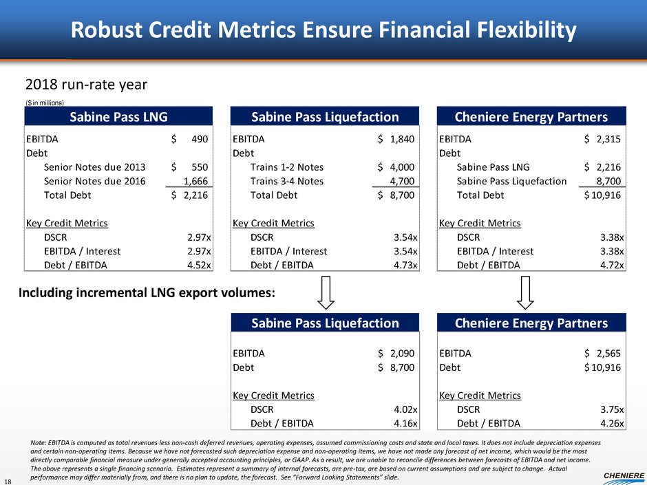 Cash Flow on CMI SPA (1) Net margins based on profitability of cargoes, up to $3.00/MMBtu paid to SPL on 36 Bcf of LNG sold in a year; 20% of net margins paid to SPL on the remaining 68 Bcf of LNG sold in the year LNG sold 104 Bcf/year Net margin $10/MMBtu Net margin $1,040 Paid to Sabine Pass Liquefaction(1) ($250) Remaining at CMI $790 Distributable to CEI based on CQP units $200 Total cash flow to CEI $990 ($ in millions unless noted) CQP CEI Note: See “Forward Looking Statements” slide. 17