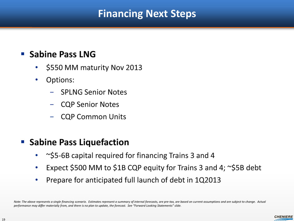 Robust Credit Metrics Ensure Financial Flexibility Including incremental LNG export volumes: ($ in millions) EBITDA 490$ EBITDA 1,840$ EBITDA 2,315$ Debt Debt Debt Senior Notes due 2013 550$ Trains 1-2 Notes 4,000$ Sabine Pass LNG 2,216$ S nior Notes due 2016 1,666 Trains 3-4 Notes 4,700 Sabine Pass Liquefaction 8,700 Total Debt 2,216$ Total Debt 8,700$ Total Debt 10,916$ Key Credit Metrics Key Credit Metrics Key Credit Metrics DSCR 2.97x DSCR 3.54x DSCR 3.38x EBITDA / Interest 2.97x EBITDA / Interest 3.54x EBITDA / Interest 3.38x Debt / EBITDA 4.52x Debt / EBITDA 4.73x Debt / EBITDA 4.72x Sabine Pass LNG Sabine Pass Liquefaction Cheniere Energy Partners 2018 run-rate year EBITDA 2,090$ EBITDA 2,565$ Debt 8,700$ Debt 10,916$ Key Credit Metrics Key Credit Metrics DSCR 4.02x DSCR 3.75x Debt / EBITDA 4.16x Debt / EBITDA 4.26x Sabine Pass Liquefaction Cheniere Energy Partners Note: EBITDA is computed as total revenues less non-cash deferred revenues, operating expenses, assumed commissioning costs and state and local taxes. It does not include depreciation expenses and certain non-operating items. Because we have not forecasted such depreciation expense and non-operating items, we have not made any forecast of net income, which would be the most directly comparable financial measure under generally accepted accounting principles, or GAAP. As a result, we are unable to reconcile differences between forecasts of EBITDA and net income. The above represents a single financing scenario. Estimates represent a summary of internal forecasts, are pre-tax, are based on current assumptions and are subject to change. Actual performance may differ materially from, and there is no plan to update, the forecast. See “Forward Looking Statements” slide. 18
