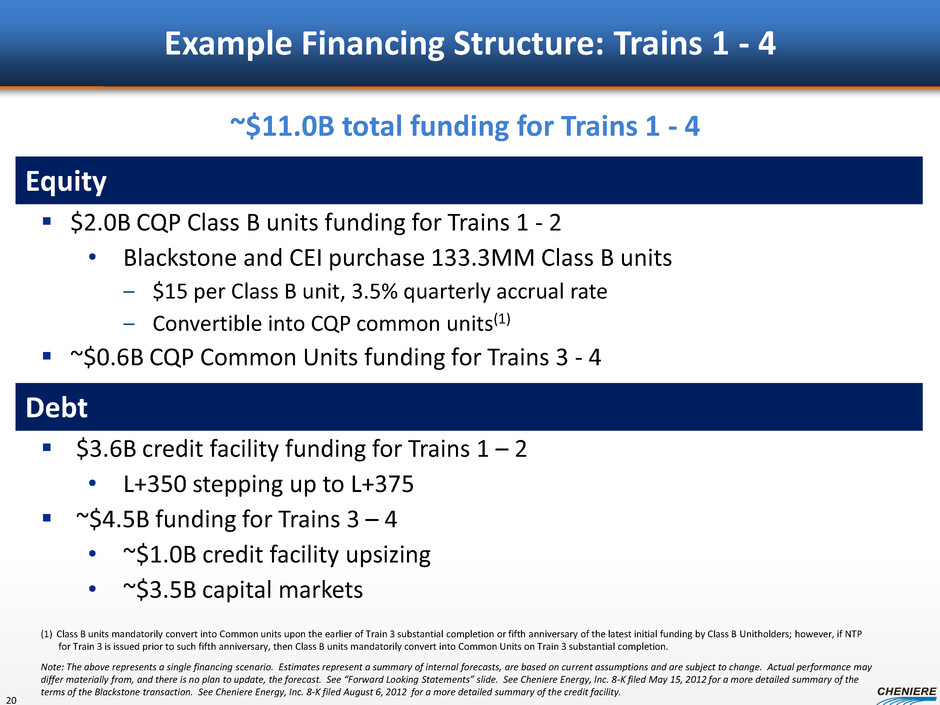 Financing Next Steps Sabine Pass LNG • $550 MM maturity Nov 2013 • Options: − SPLNG Senior Notes − CQP Senior Notes − CQP Common Units Sabine Pass Liquefaction • ~$5-6B capital required for financing Trains 3 and 4 • Expect $500 MM to $1B CQP equity for Trains 3 and 4; ~$5B debt • Prepare for anticipated full launch of debt in 1Q2013 19 Note: The above represents a single financing scenario. Estimates represent a summary of internal forecasts, are pre-tax, are based on current assumptions and are subject to change. Actual performance may differ materially from, and there is no plan to update, the forecast. See “Forward Looking Statements” slide.