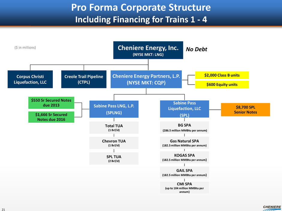 Example Financing Structure: Trains 1 - 4 ~$11.0B total funding for Trains 1 - 4 Equity $2.0B CQP Class B units funding for Trains 1 - 2 • Blackstone and CEI purchase 133.3MM Class B units ‒ $15 per Class B unit, 3.5% quarterly accrual rate ‒ Convertible into CQP common units(1) ~$0.6B CQP Common Units funding for Trains 3 - 4 Debt $3.6B credit facility funding for Trains 1 – 2 • L+350 stepping up to L+375 ~$4.5B funding for Trains 3 – 4 • ~$1.0B credit facility upsizing • ~$3.5B capital markets (1) Class B units mandatorily convert into Common units upon the earlier of Train 3 substantial completion or fifth anniversary of the latest initial funding by Class B Unitholders; however, if NTP for Train 3 is issued prior to such fifth anniversary, then Class B units mandatorily convert into Common Units on Train 3 substantial completion. Note: The above represents a single financing scenario. Estimates represent a summary of internal forecasts, are based on current assumptions and are subject to change. Actual performance may differ materially from, and there is no plan to update, the forecast. See “Forward Looking Statements” slide. See Cheniere Energy, Inc. 8-K filed May 15, 2012 for a more detailed summary of the terms of the Blackstone transaction. See Cheniere Energy, Inc. 8-K filed August 6, 2012 for a more detailed summary of the credit facility. 20