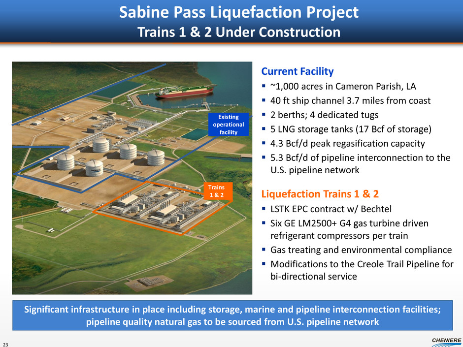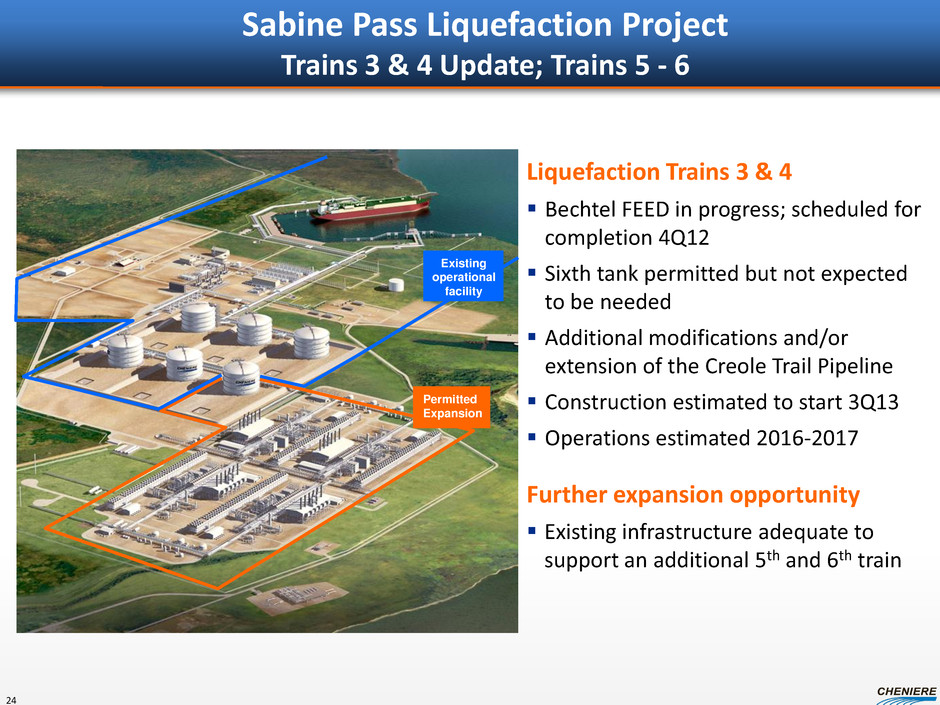 Sabine Pass Liquefaction Project Trains 1 & 2 Under Construction Current Facility ~1,000 acres in Cameron Parish, LA 40 ft ship channel 3.7 miles from coast 2 berths; 4 dedicated tugs 5 LNG storage tanks (17 Bcf of storage) 4.3 Bcf/d peak regasification capacity 5.3 Bcf/d of pipeline interconnection to the U.S. pipeline network Liquefaction Trains 1 & 2 LSTK EPC contract w/ Bechtel Six GE LM2500+ G4 gas turbine driven refrigerant compressors per train Gas treating and environmental compliance Modifications to the Creole Trail Pipeline for bi-directional service Significant infrastructure in place including storage, marine and pipeline interconnection facilities; pipeline quality natural gas to be sourced from U.S. pipeline network Existing operational facility Trains 1 & 2 23