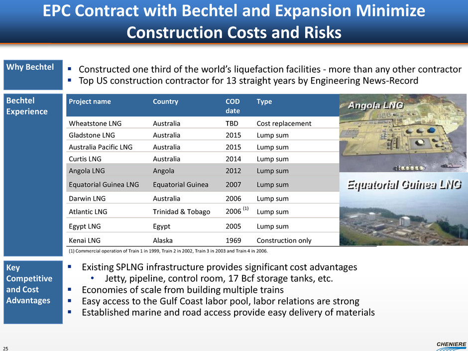 Sabine Pass Liquefaction Project Trains 3 & 4 Update; Trains 5 - 6 Liquefaction Trains 3 & 4 Bechtel FEED in progress; scheduled for completion 4Q12 Sixth tank permitted but not expected to be needed Additional modifications and/or extension of the Creole Trail Pipeline Construction estimated to start 3Q13 Operations estimated 2016-2017 Further expansion opportunity Existing infrastructure adequate to support an additional 5th and 6th train Existing operational facility Permitted Expansion 24