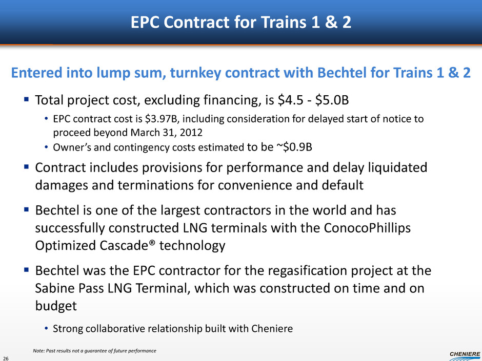 Why Bechtel Constructed one third of the world’s liquefaction facilities - more than any other contractor Top US construction contractor for 13 straight years by Engineering News-Record Bechtel Experience Key Competitive and Cost Advantages Existing SPLNG infrastructure provides significant cost advantages • Jetty, pipeline, control room, 17 Bcf storage tanks, etc. Economies of scale from building multiple trains Easy access to the Gulf Coast labor pool, labor relations are strong Established marine and road access provide easy delivery of materials Project name Country COD date Type Wheatstone LNG Australia TBD Cost replacement Gladstone LNG Australia 2015 Lump sum Australia Pacific LNG Australia 2015 Lump sum Curtis LNG Australia 2014 Lump sum Angola LNG Angola 2012 Lump sum Equatorial Guinea LNG Equatorial Guinea 2007 Lump sum Darwin LNG Australia 2006 Lump sum Atlantic LNG Trinidad & Tobago 2006 (1) Lump sum Egypt LNG Egypt 2005 Lump sum Kenai LNG Alaska 1969 Construction only (1) Commercial operation of Train 1 in 1999, Train 2 in 2002, Train 3 in 2003 and Train 4 in 2006. EPC Contract with Bechtel and Expansion Minimize Construction Costs and Risks 25
