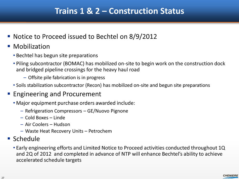 EPC Contract for Trains 1 & 2 Total project cost, excluding financing, is $4.5 - $5.0B • EPC contract cost is $3.97B, including consideration for delayed start of notice to proceed beyond March 31, 2012 • Owner’s and contingency costs estimated to be ~$0.9B Contract includes provisions for performance and delay liquidated damages and terminations for convenience and default Bechtel is one of the largest contractors in the world and has successfully constructed LNG terminals with the ConocoPhillips Optimized Cascade® technology Bechtel was the EPC contractor for the regasification project at the Sabine Pass LNG Terminal, which was constructed on time and on budget • Strong collaborative relationship built with Cheniere Entered into lump sum, turnkey contract with Bechtel for Trains 1 & 2 26 Note: Past results not a guarantee of future performance