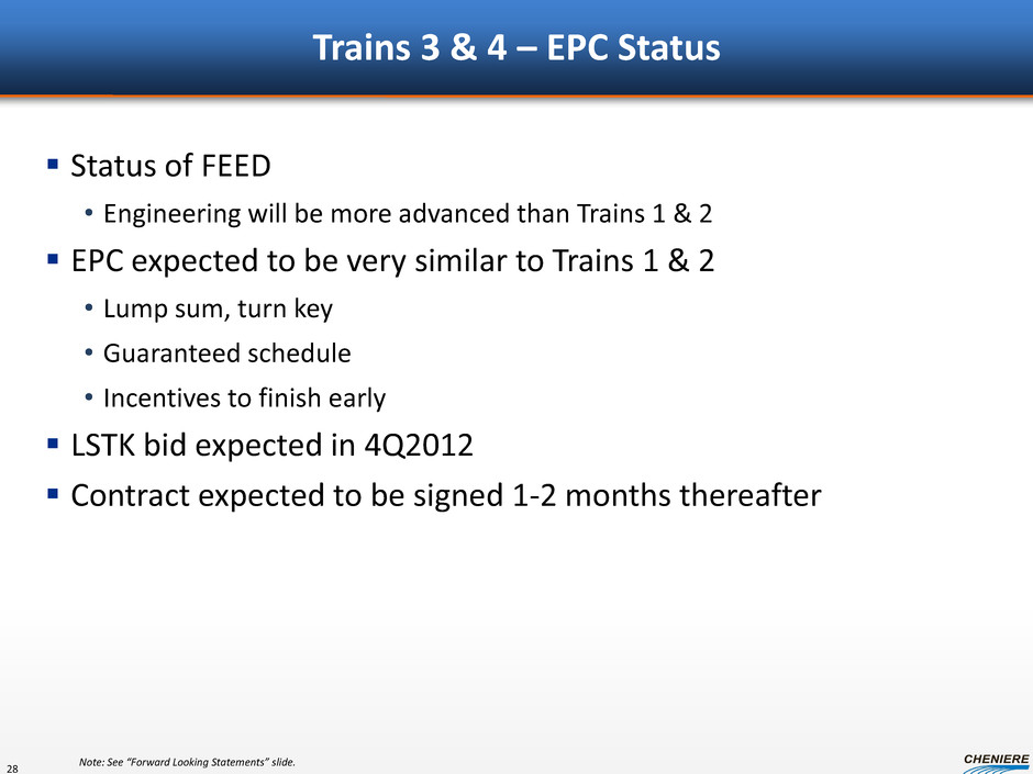 Trains 1 & 2 – Construction Status Notice to Proceed issued to Bechtel on 8/9/2012 Mobilization • Bechtel has begun site preparations • Piling subcontractor (BOMAC) has mobilized on-site to begin work on the construction dock and bridged pipeline crossings for the heavy haul road – Offsite pile fabrication is in progress • Soils stabilization subcontractor (Recon) has mobilized on-site and begun site preparations Engineering and Procurement •Major equipment purchase orders awarded include: – Refrigeration Compressors – GE/Nuovo Pignone – Cold Boxes – Linde – Air Coolers – Hudson – Waste Heat Recovery Units – Petrochem Schedule • Early engineering efforts and Limited Notice to Proceed activities conducted throughout 1Q and 2Q of 2012 and completed in advance of NTP will enhance Bechtel’s ability to achieve accelerated schedule targets 27