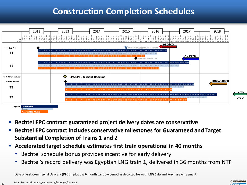Date Jan -12 Feb -12 Mar -12 Apr -12 May -12 Jun -12 Jul- 12 Aug -12 Sep -12 Oct -12 Nov -12 Dec -12 Jan -13 Feb -13 Mar -13 Apr -13 May -13 Jun -13 Jul- 13 Aug -13 Sep -13 Oct -13 Nov -13 Dec -13 Jan -14 Feb -14 Mar -14 Apr -14 May -14 Jun -14 Jul- 14 Aug -14 Sep -14 Oct -14 Nov -14 Dec -14 Jan -15 Feb -15 Mar -15 Apr -15 May -15 Jun -15 Jul- 15 Aug -15 Sep -15 Oct -15 Nov -15 Dec -15 Jan -16 Feb -16 Mar -16 Apr -16 May -16 Jun -16 Jul- 16 Aug -16 Sep -16 Oct -16 Nov -16 Dec -16 Jan -17 Feb -17 Mar -17 Apr -17 May -17 Jun -17 Jul- 17 Aug -17 Sep -17 Oct -17 Nov -17 Dec -17 Jan -18 Feb -18 Mar -18 Apr -18 May -18 Jun -18 Jul- 18 Aug -18 Sep -18 Oct -18 Nov -18 Dec -18 Month 1 2 3 4 5 6 7 8 9 10 11 12 13 14 15 16 17 18 19 20 21 22 23 24 25 26 27 28 29 30 31 32 33 34 35 36 37 38 39 40 41 42 43 44 45 46 47 48 49 50 51 52 53 54 55 56 57 58 59 60 61 62 63 64 65 66 67 68 69 70 71 72 73 74 75 76 77 T1 & 2 NTP Record First LNG; Egyptian LNG T1, May 2005 1 2 3 4 5 6 7 8 9 10 11 12 13 14 15 16 17 18 19 20 21 22 23 24 25 26 27 28 29 30 31 32 33 34 35 36 37 38 39 40 41 42 43 44 45 46 47 48 49 50 51 52 1 2 3 4 5 6 7 8 9 10 11 12 13 14 15 16 17 18 19 20 21 22 23 24 25 26 27 28 29 30 31 32 33 34 35 36 37 38 39 40 41 42 43 44 45 46 47 48 1 2 3 4 5 6 7 8 9 10 11 12 13 14 15 16 17 18 19 20 21 22 23 24 25 26 27 28 29 30 31 32 33 34 35 36 37 38 39 40 41 42 43 Accelerated Target First LNG 1 2 3 4 5 6 7 8 9 10 11 12 13 14 15 16 17 18 19 20 21 22 23 24 25 26 27 28 29 30 31 32 33 34 35 36 37 38 39 40 41 42 43 44 45 46 47 48 49 50 51 52 53 54 55 56 57 58 59 60 61 1 2 3 4 5 6 7 8 9 10 11 12 13 14 15 16 17 18 19 20 21 22 23 24 25 26 27 28 29 30 31 32 33 34 35 36 37 38 39 40 41 42 43 44 45 46 47 48 49 50 51 52 53 54 55 56 57 1 2 3 4 5 6 7 8 9 10 11 12 13 14 15 16 17 18 19 20 21 22 23 24 25 26 27 28 29 30 31 32 33 34 35 36 37 38 39 40 41 42 43 44 45 46 47 48 49 T3 & 4 PLANNING Common NTP 1 2 3 4 5 6 7 8 9 10 11 12 13 14 15 16 17 18 19 20 21 22 23 24 25 26 27 28 29 30 31 32 33 34 35 36 37 38 39 40 41 42 43 44 45 46 47 48 49 50 51 52 1 2 3 4 5 6 7 8 9 10 11 12 13 14 15 16 17 18 19 20 21 22 23 24 25 26 27 28 29 30 31 32 33 34 35 36 37 38 39 40 41 42 43 44 45 46 47 48 1 2 3 4 5 6 7 8 9 10 11 12 13 14 15 16 17 18 19 20 21 22 23 24 25 26 27 28 29 30 31 32 33 34 35 36 37 38 39 40 41 42 43 1 2 3 4 5 6 7 8 9 10 11 12 13 14 15 16 17 18 19 20 21 22 23 24 25 26 27 28 29 30 31 32 33 34 35 36 37 38 39 40 41 42 43 44 45 46 47 48 49 50 51 52 53 54 55 56 57 58 59 60 61 1 2 3 4 5 6 7 8 9 10 11 12 13 14 15 16 17 18 19 20 21 22 23 24 25 26 27 28 29 30 31 32 33 34 35 36 37 38 39 40 41 42 43 44 45 46 47 48 49 50 51 52 53 54 55 56 57 1 2 3 4 5 6 7 8 9 10 11 12 13 14 15 16 17 18 19 20 21 22 23 24 25 26 27 28 29 30 31 32 33 34 35 36 37 38 39 40 41 42 43 44 45 46 47 48 49 Legend: Accelerated Target 20182012 2013 2014 2015 2016 2017 Guaranteed Target Construction Completion Schedules Bechtel EPC contract guaranteed project delivery dates are conservative Bechtel EPC contract includes conservative milestones for Guaranteed and Target Substantial Completion of Trains 1 and 2 Accelerated target schedule estimates first train operational in 40 months • Bechtel schedule bonus provides incentive for early delivery • Bechtel’s record delivery was Egyptian LNG train 1, delivered in 36 months from NTP GN DFCD BG DFCD KOGAS DFCD GAIL DFCD SPA CP Fulfillment Deadline T1 2013 2014 2015 2016 2017 2018 Date of First Commercial Delivery (DFCD), plus the 6 month window period, is depicted for each LNG Sale and Purchase Agreement T2 T3 T4 2012 Note: Past results not a guarantee of future performance. 29