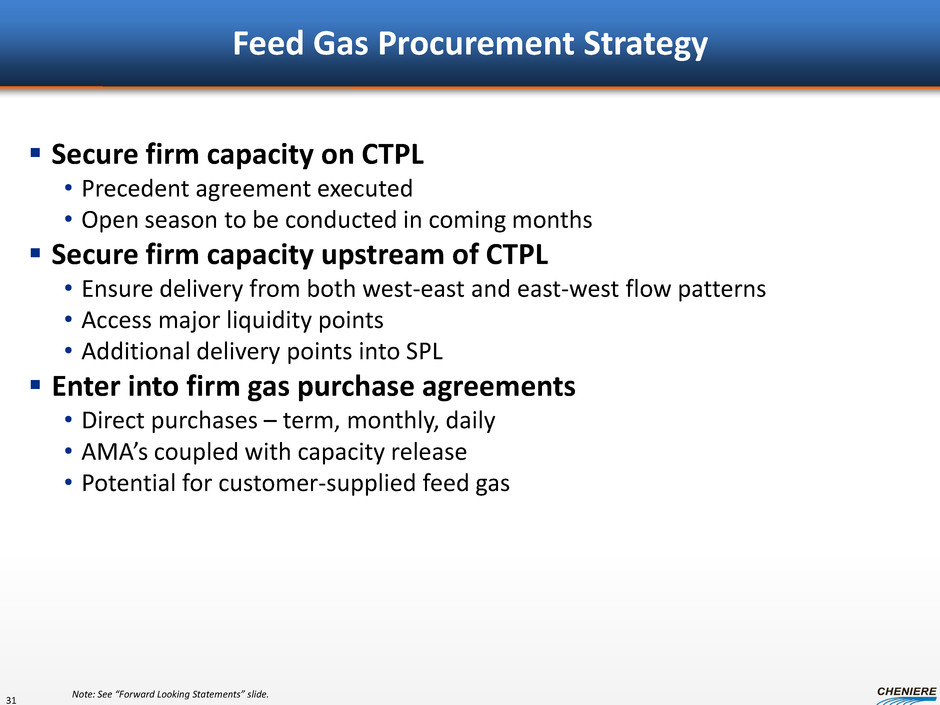 Feed Gas Procurement Strategy Secure firm capacity on CTPL • Precedent agreement executed • Open season to be conducted in coming months Secure firm capacity upstream of CTPL • Ensure delivery from both west-east and east-west flow patterns • Access major liquidity points • Additional delivery points into SPL Enter into firm gas purchase agreements • Direct purchases – term, monthly, daily • AMA’s coupled with capacity release • Potential for customer-supplied feed gas 31 Note: See “Forward Looking Statements” slide.