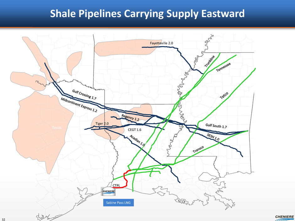 Shale Pipelines Carrying Supply Eastward Texas Oklahoma Alabama Louisiana Mississippi Arkansas Tennessee Tiger 2.0 CEGT 1.6 Fayetteville 2.0 Sabine Pass LNG CTPL 32